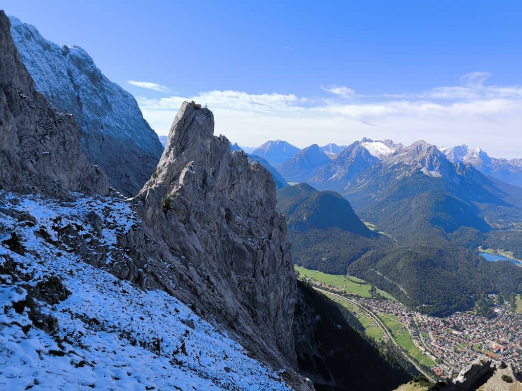 In kleinerer Besetzung als geplant (einer Neukrank), kraxelten wir am Einheitsfeierfreitag von Mittenwald über die vordere Kreuzklamm auf die 4er-Spitze über den Südwestgrat. Kältebedingt – über 1400m schattseitig Dauerfrost –
