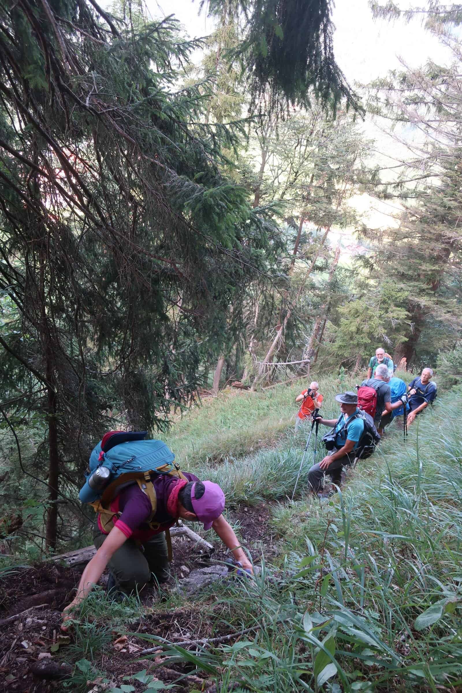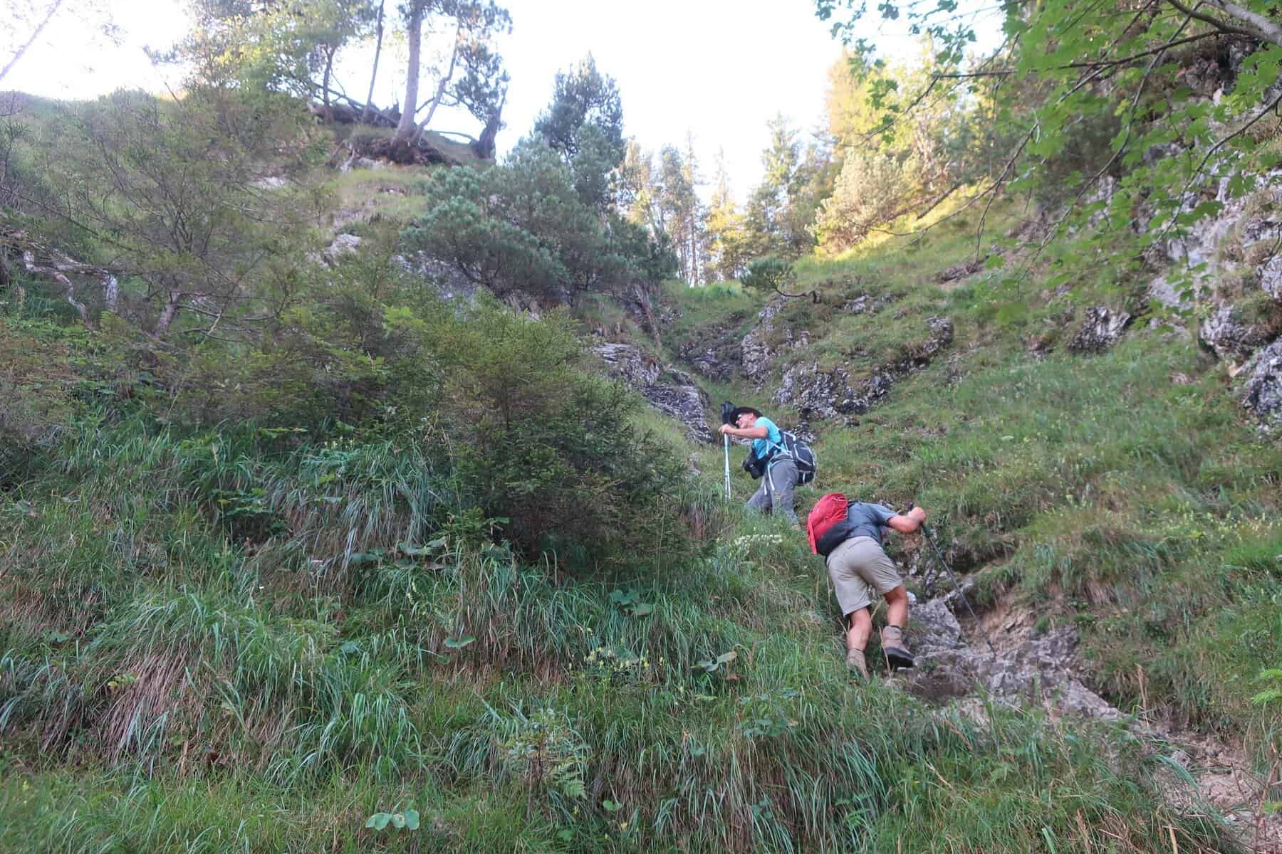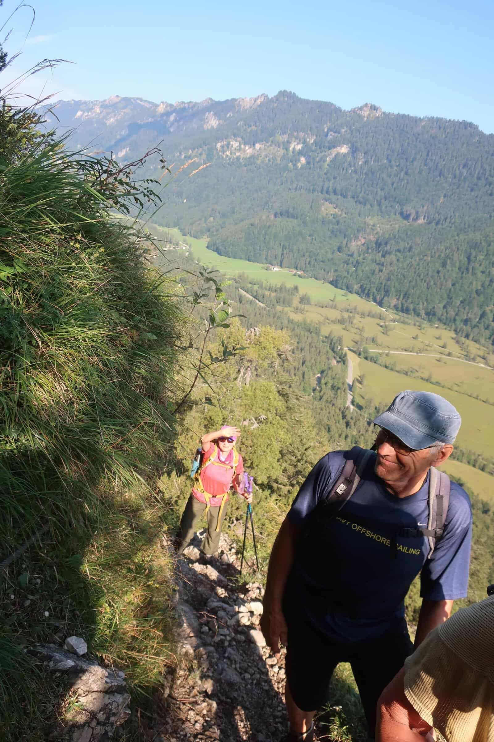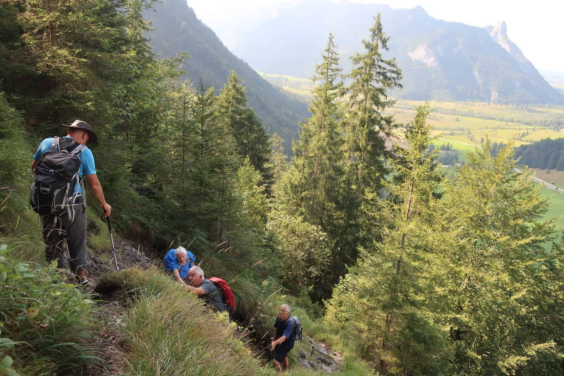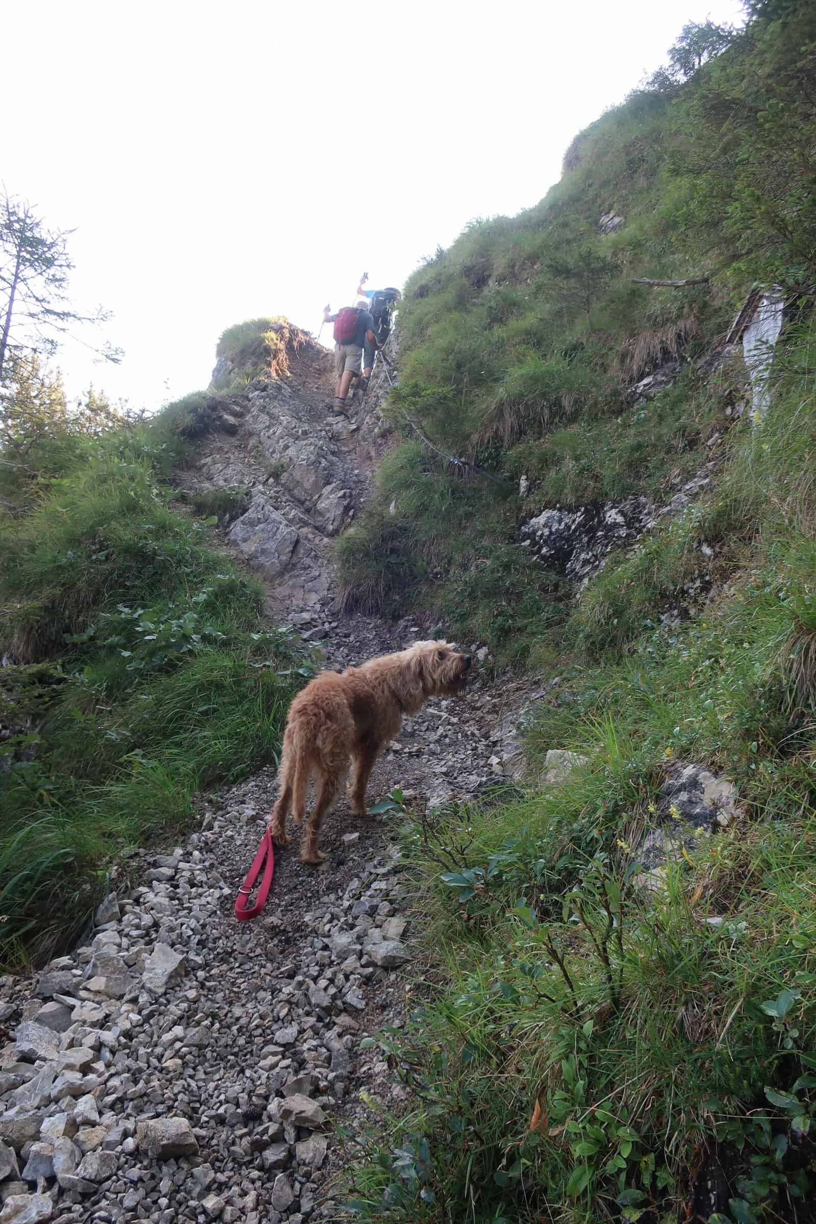 Wir fragten uns schon wie hier Almwirtschaft überhaupt möglich war. Die engen, steilen Steige die wir Wanderer nutzten, waren ungeeignet das Vieh heraufzubringen. Man musste die Tiere deshalb vom Ettaler Sattel über OCHSENSITZ zu den Almen treiben. Alles ziemlich mühsam für ein wenig Gras im gefährlichen Gelände. So wurden hier alle Almen Anfang des 20. Jh. aufgelassen.