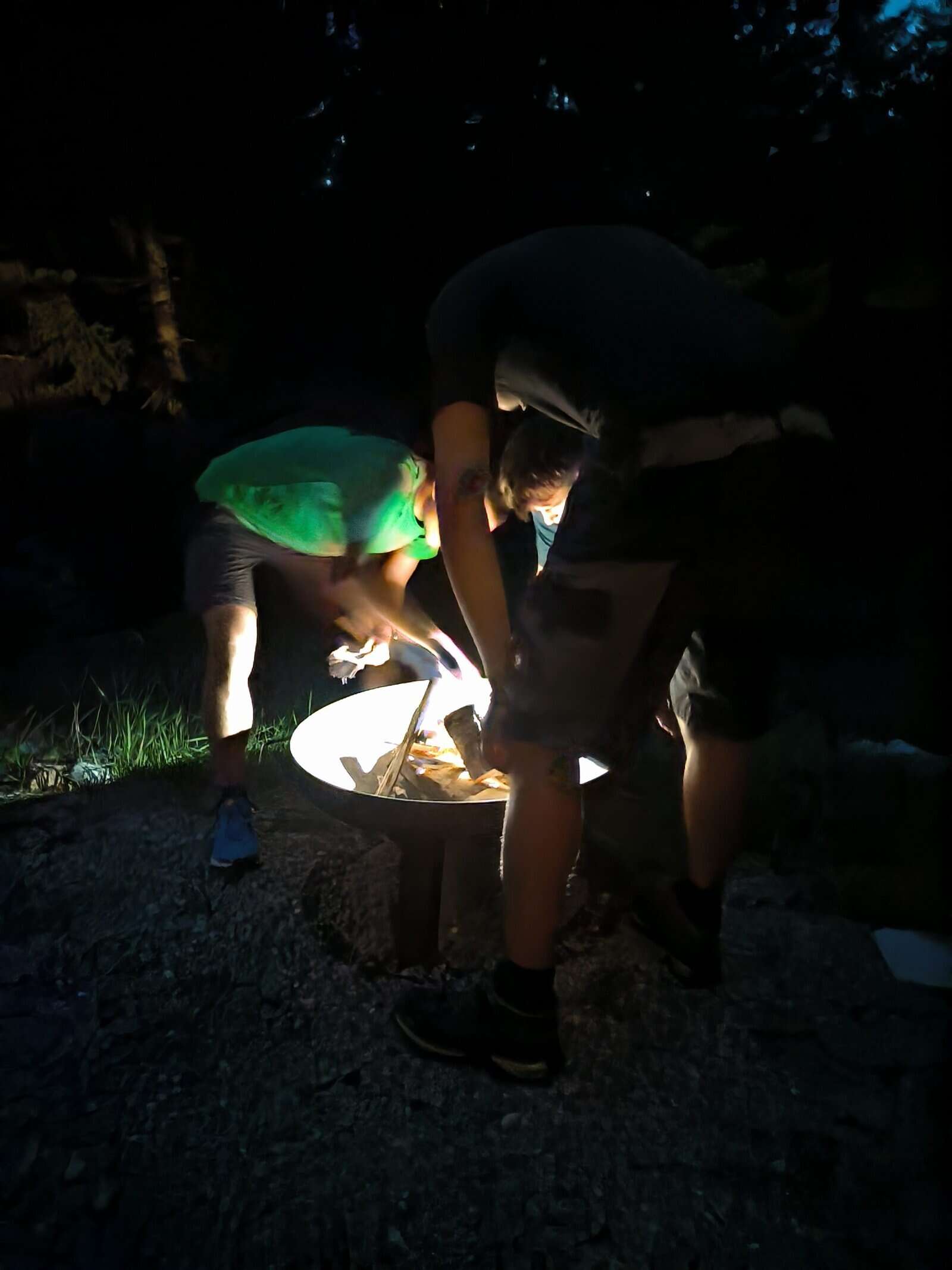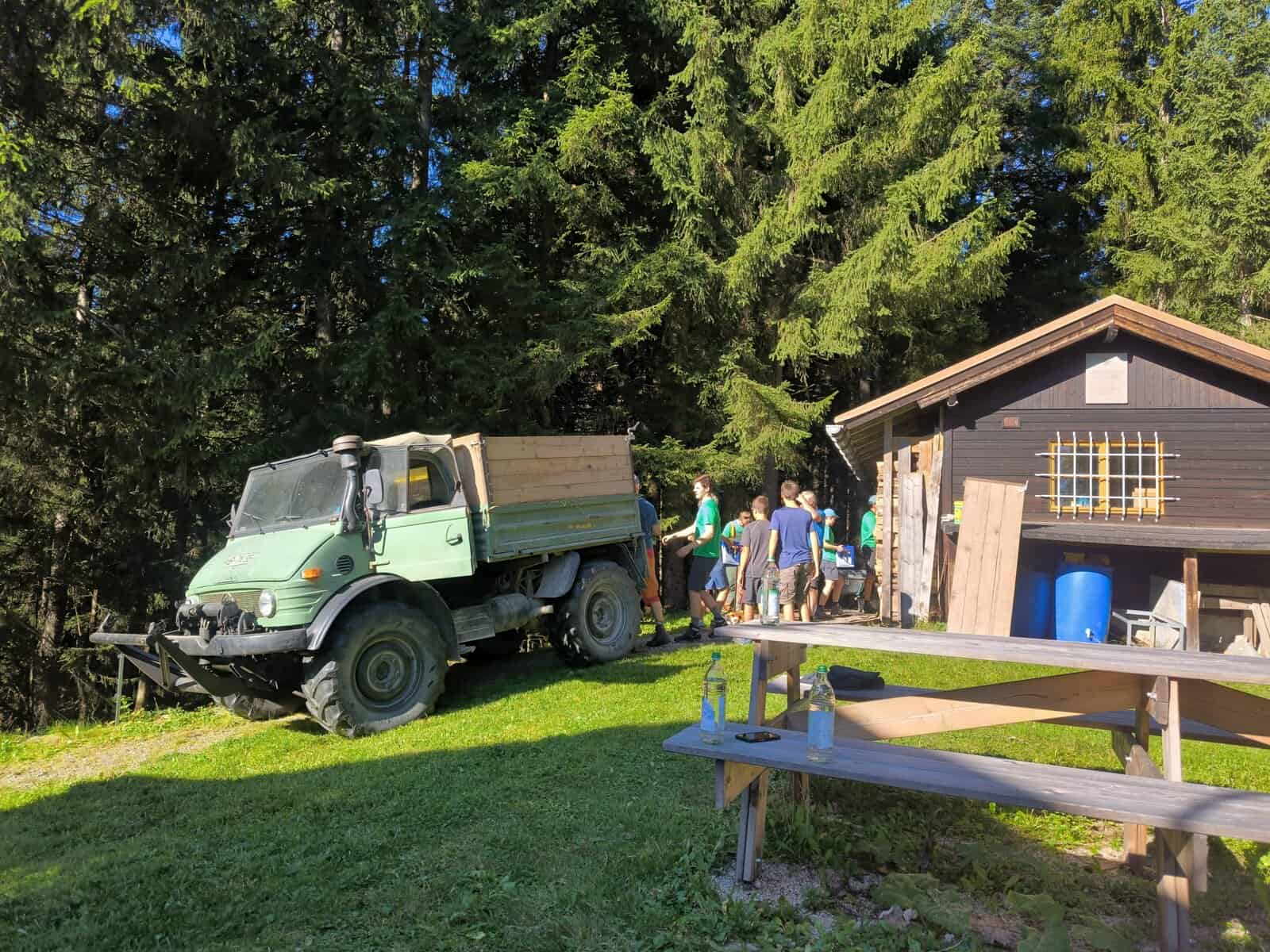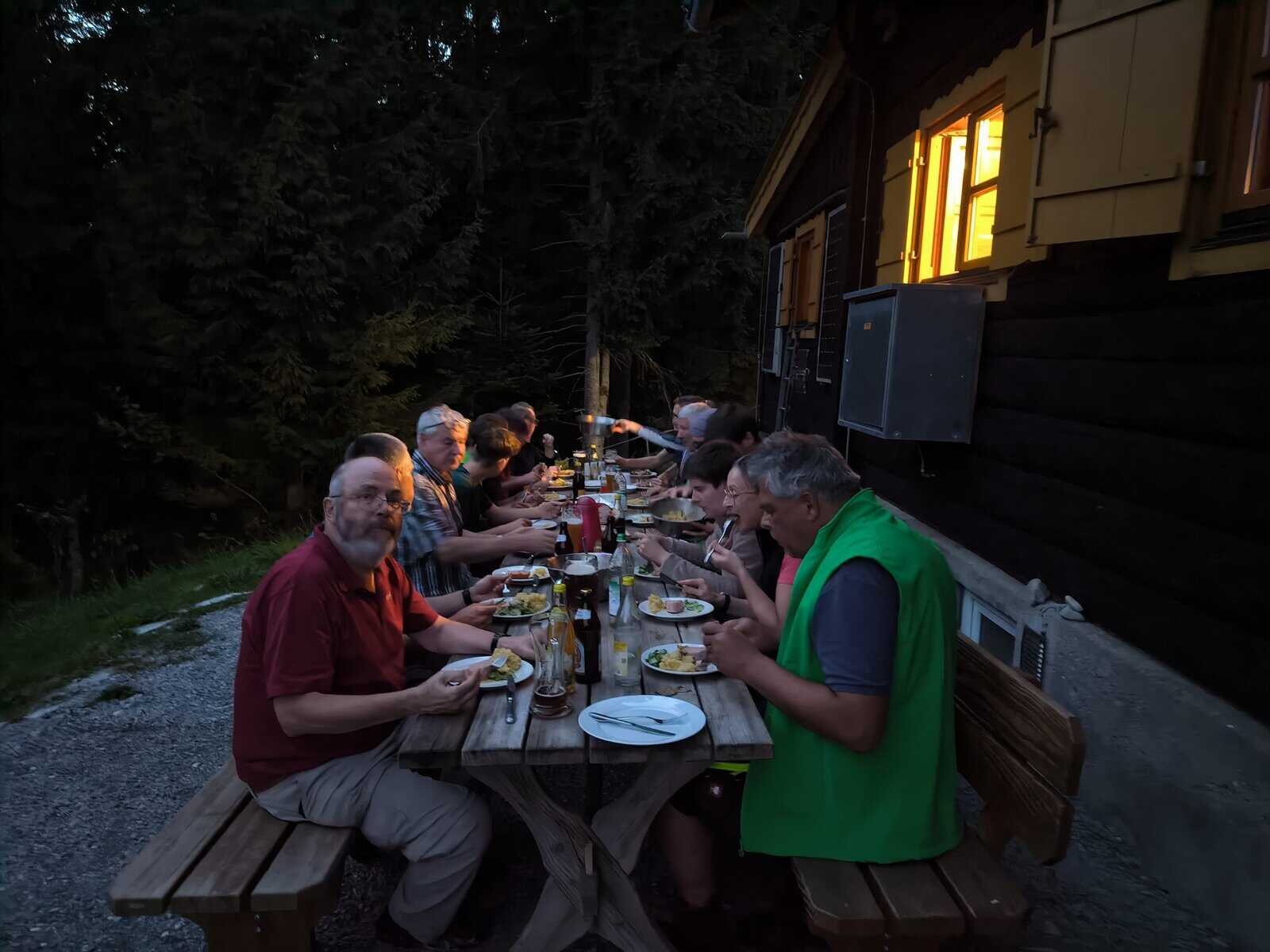 Am Freitagabend wurden die Lager gereinigt und hergerichtet für das Winterhalbjahr, das Holzhacken wurde begonnen und Hubert bereitete seinen Kartoffelsalat mit fleißigen Helfern sowie 4 kg Leberkäs im nagelneuen Holzofen vor. Freitagabend verbrachten wir draußen neben der Hütte.