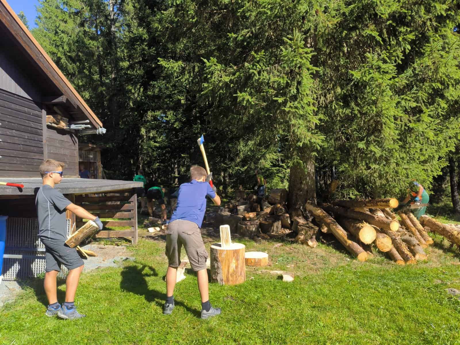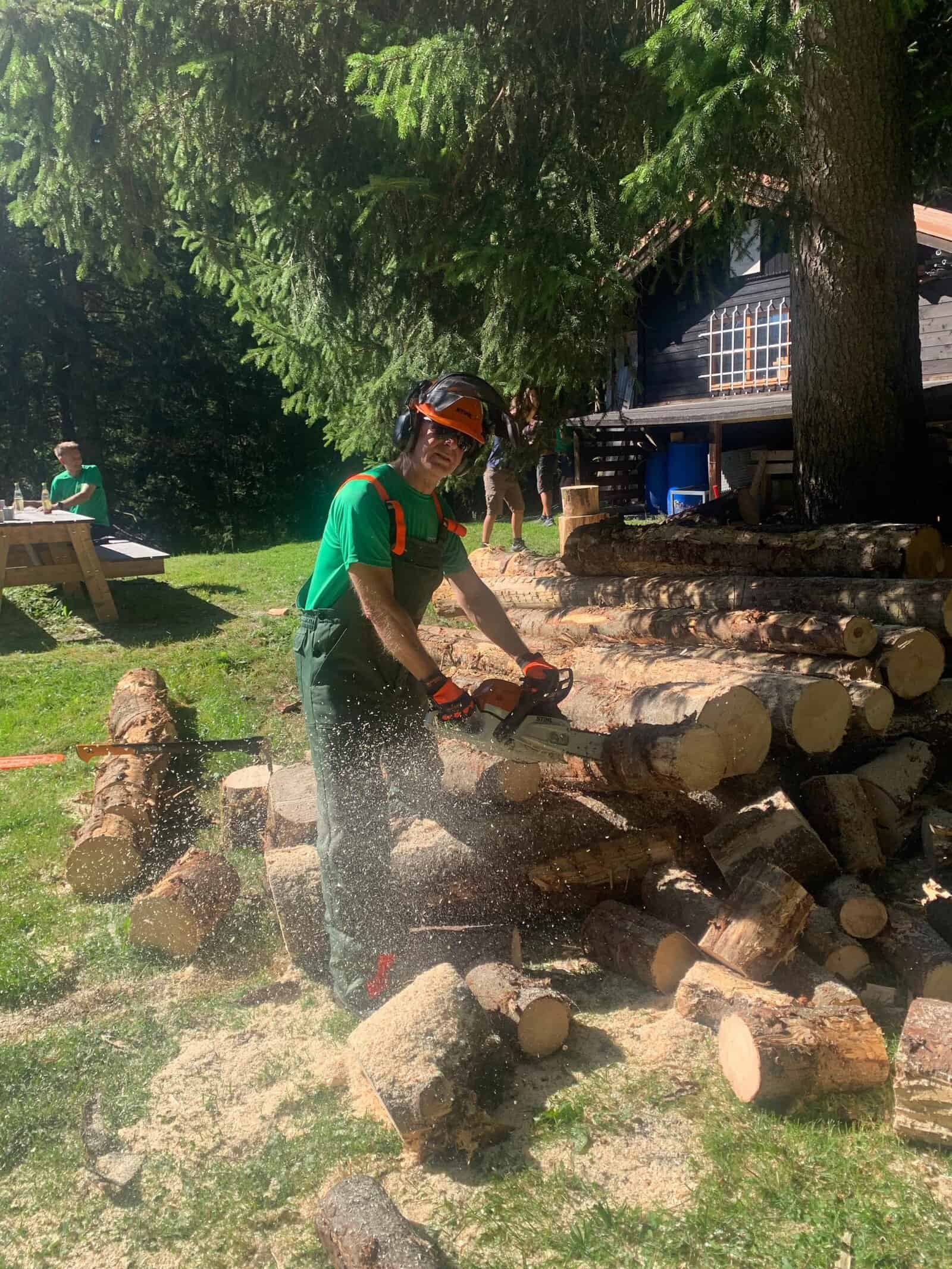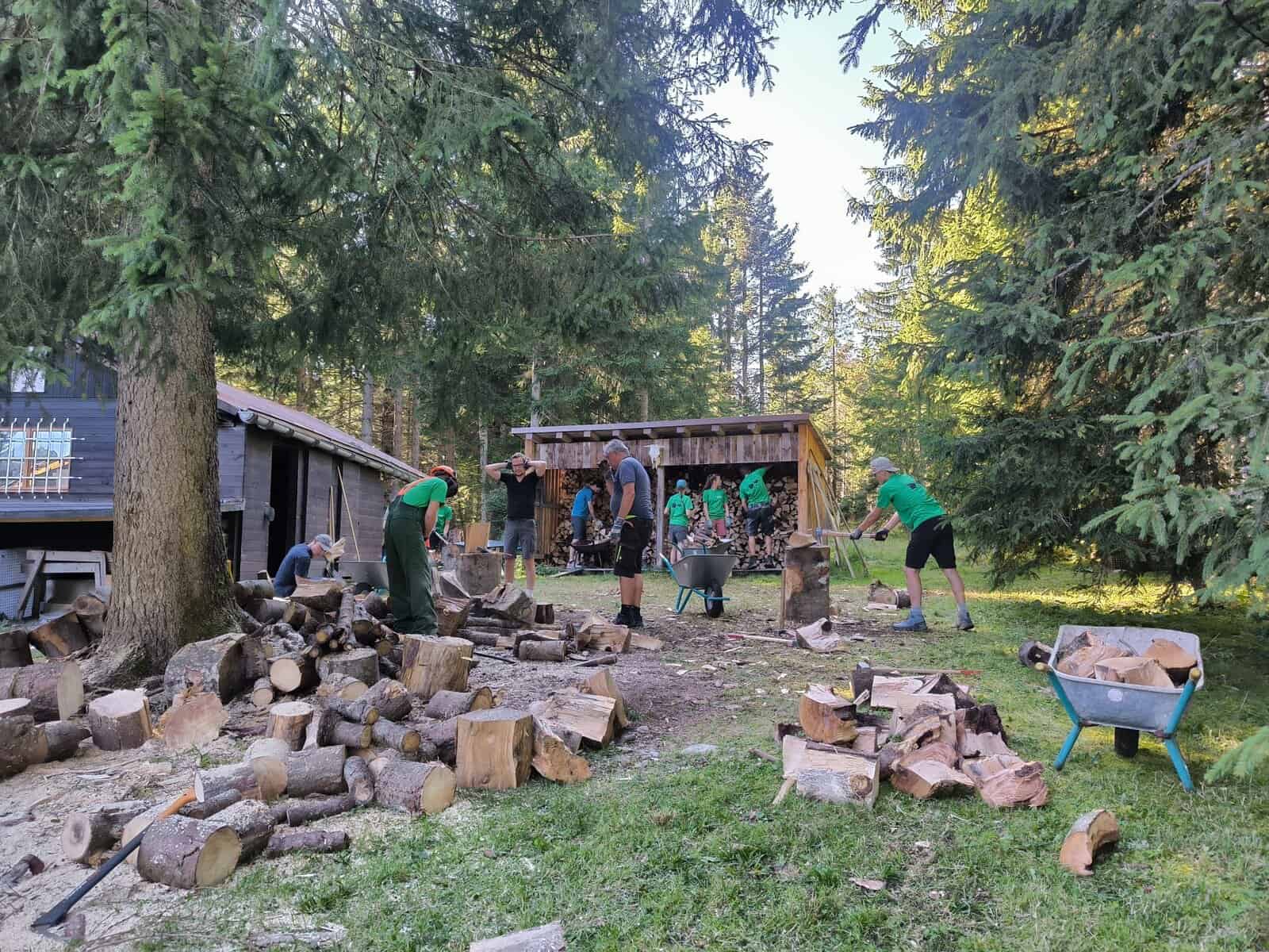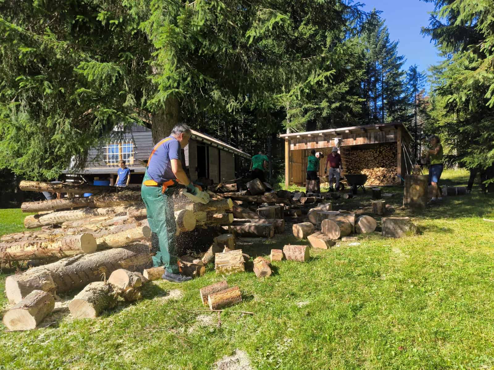 Nach einer warmen Nacht wurde am Samstag mit 27 Helfern (14 bis über 70 Jahre alt) emsig die Hütte gereinigt, die Wasserversorgung gewartet, der Garten gemäht, die Getränkelieferung verräumt, … und das Feuerholz gesägt, gespalten, gehackt und gestapelt. Nicht zu vergessen zu erwähnen hierbei ist das gemeinsame Mittagessen, in diesem Jahr gabs Chili con Carne mit Salat und anschließend ein abwechslungsreiches Kuchenbuffet.