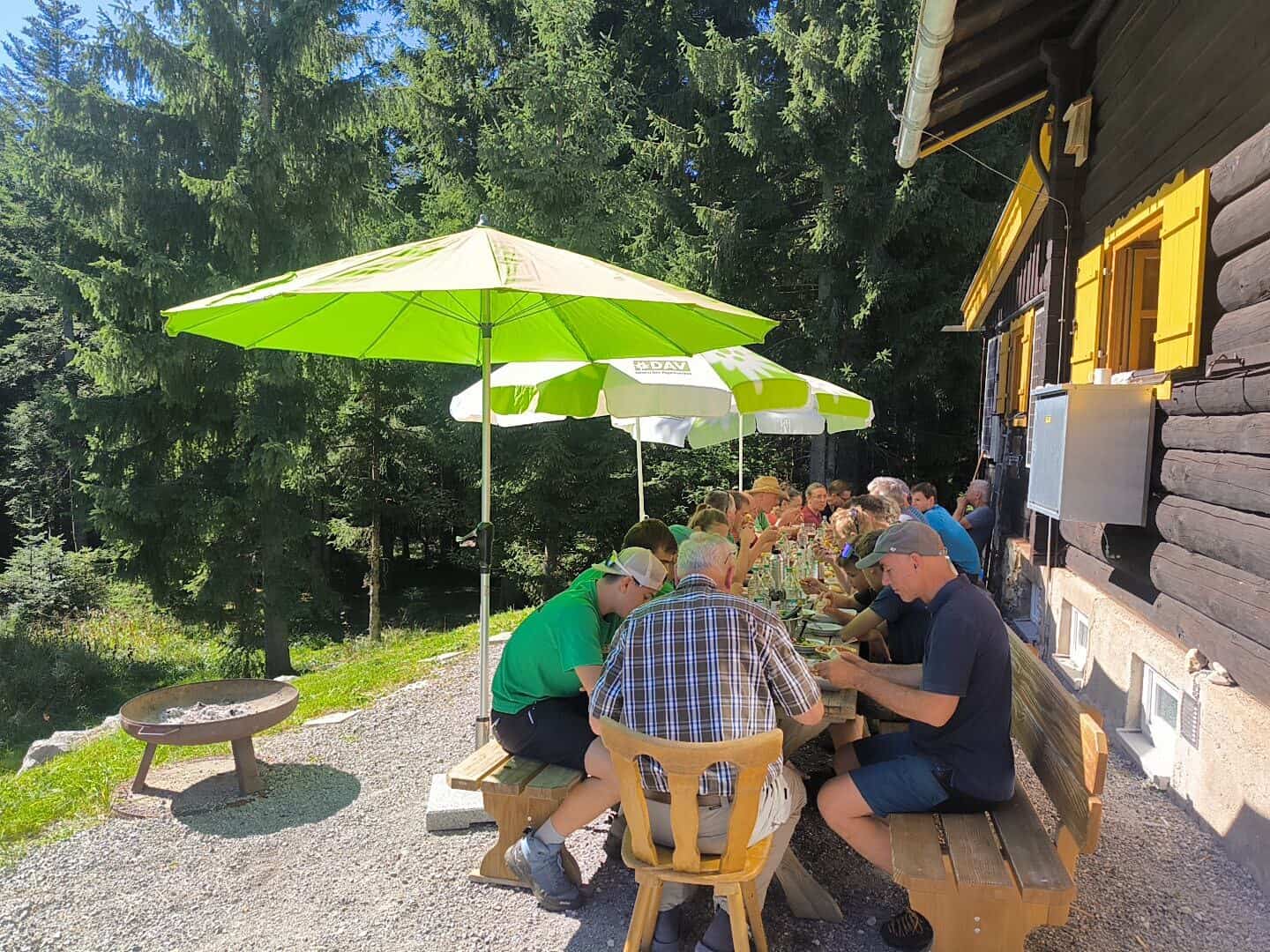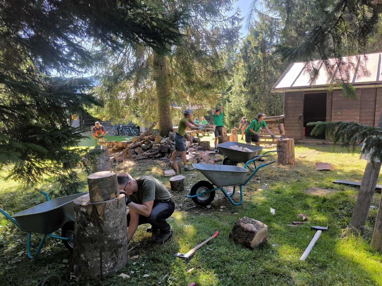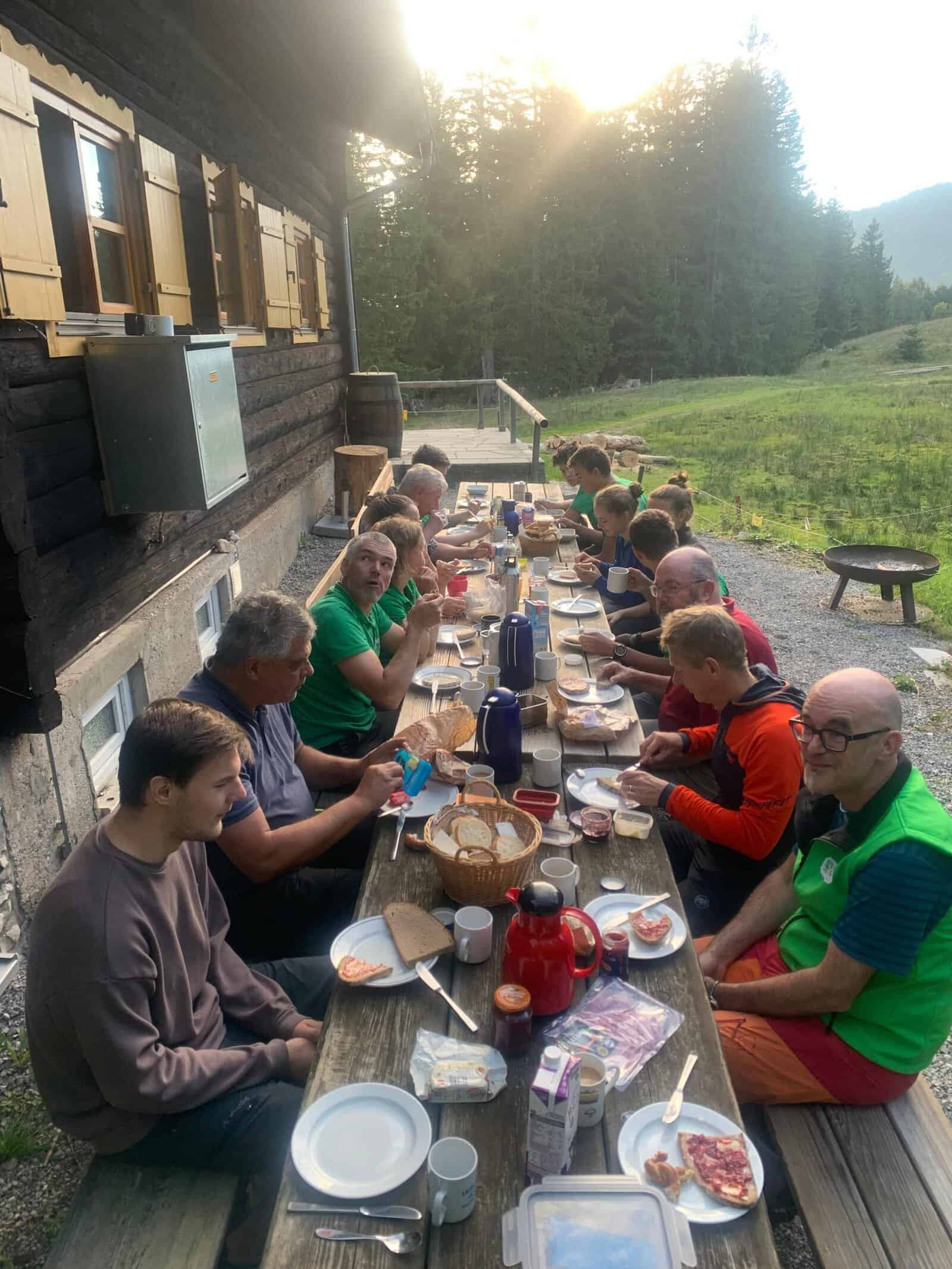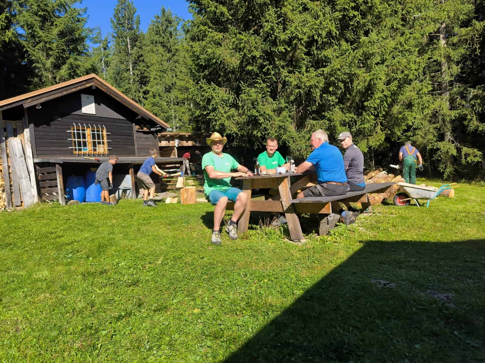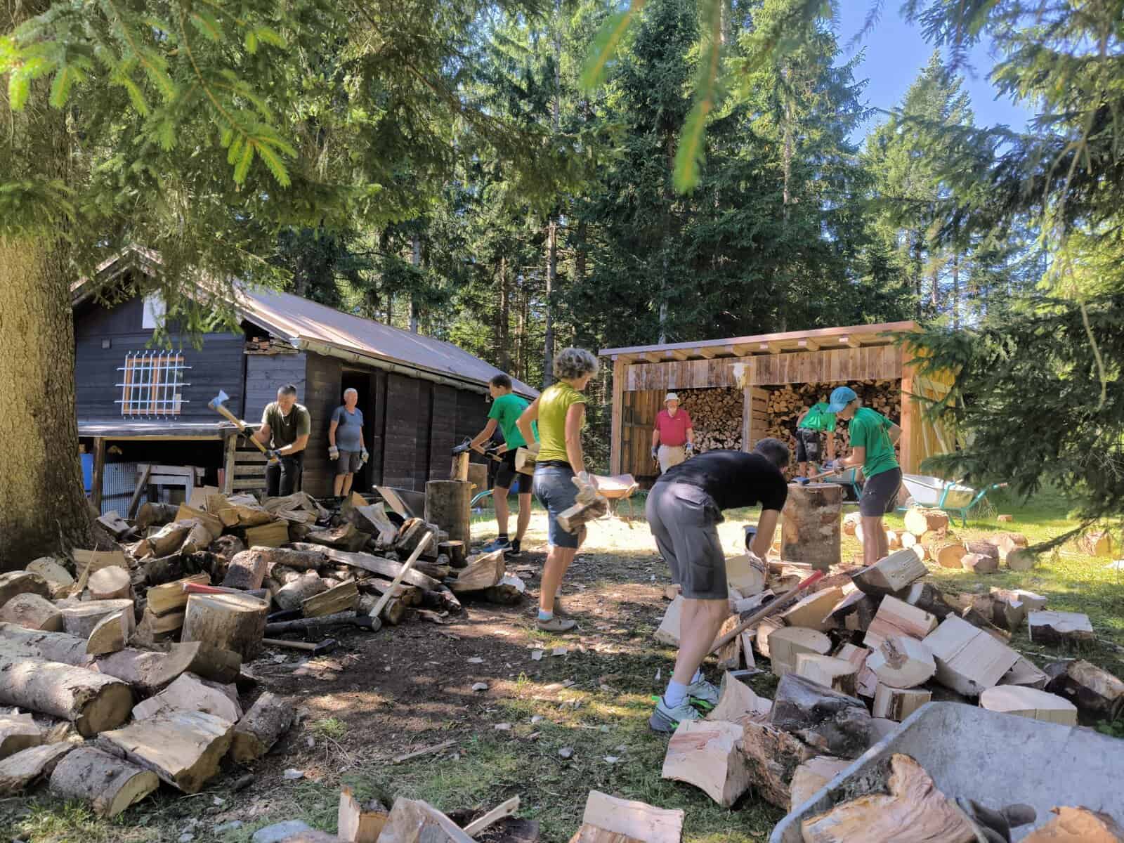 Nach einer warmen Nacht wurde am Samstag mit 27 Helfern (14 bis über 70 Jahre alt) emsig die Hütte gereinigt, die Wasserversorgung gewartet, der Garten gemäht, die Getränkelieferung verräumt, … und das Feuerholz gesägt, gespalten, gehackt und gestapelt. Nicht zu vergessen zu erwähnen hierbei ist das gemeinsame Mittagessen, in diesem Jahr gabs Chili con Carne mit Salat und anschließend ein abwechslungsreiches Kuchenbuffet.