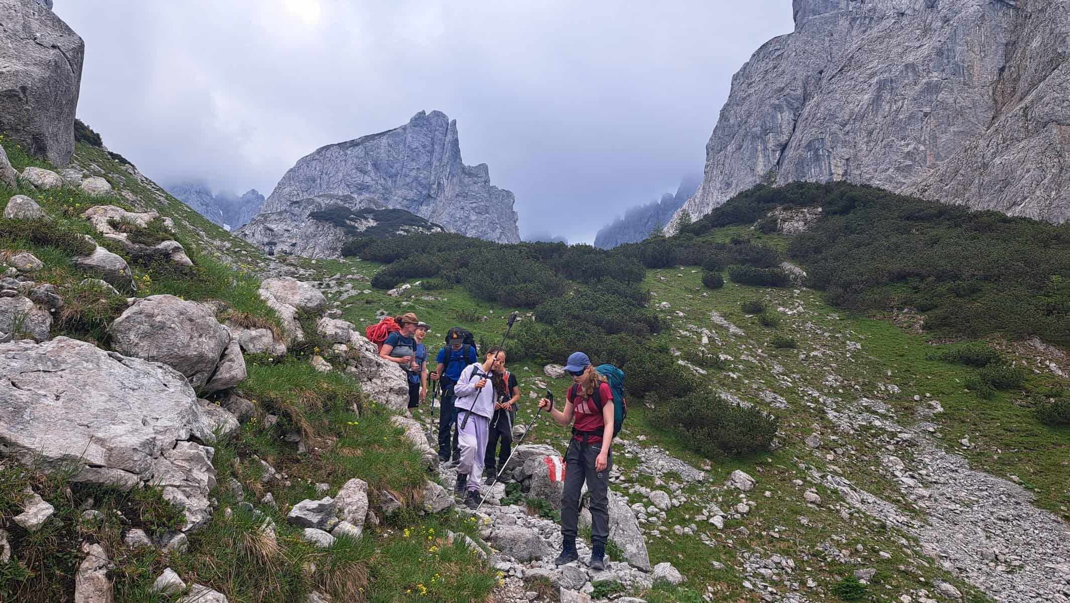Wir sind eine bunte, motivierte Truppe mit viel Vorfreude auf Fels und Bergluft. Während die meisten noch nach Ausreden suchten, warum der Rucksack „diesmal wirklich viel schwerer“ sei, rannte Antonia – unsere Jüngste – allen davon. Wir anderen hechelten hinterher und fragten uns leise, ob wir uns in Zukunft an ihrem Trainingsplan orientieren sollten.
