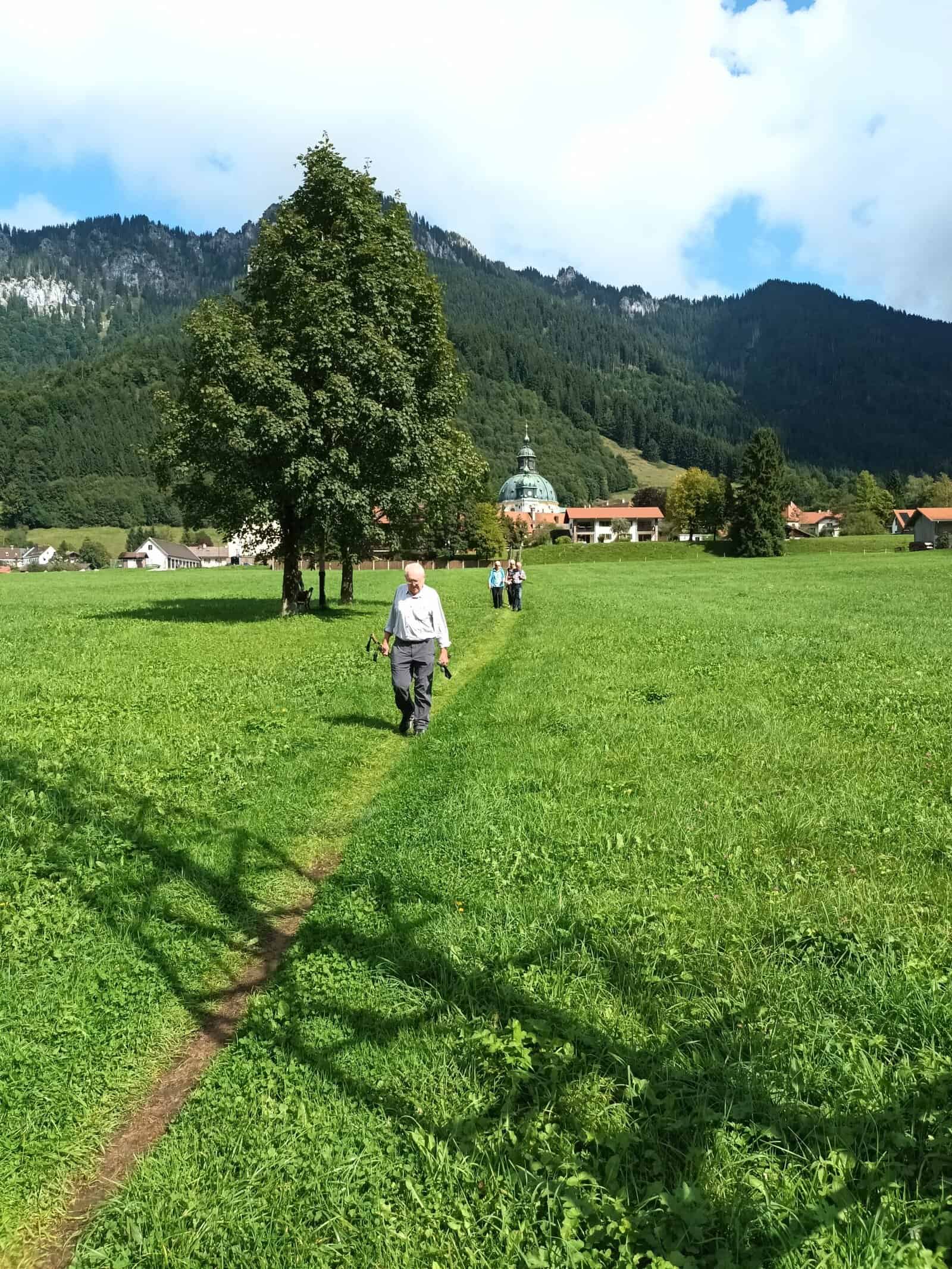 Schließlich verließen wir den Wald und waren begeistert von der wunderschönen Aussicht auf die mächtige Klosteranlage von Ettal. Nach einem kurzen Stück auf der Straße durch den Ort, ging es auf einem Wiesenpfad zum Waldrand.