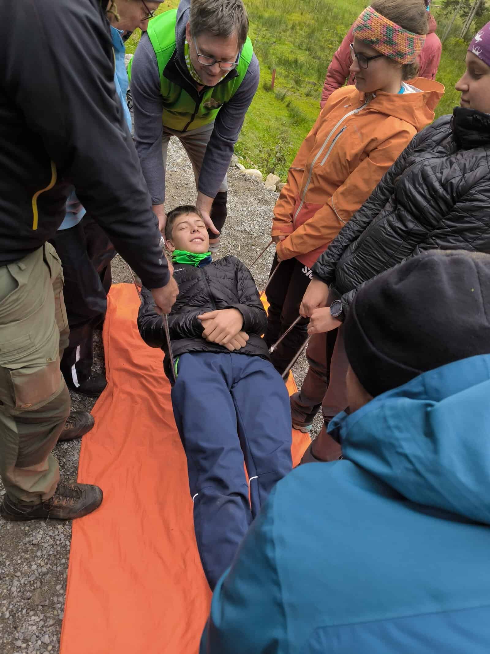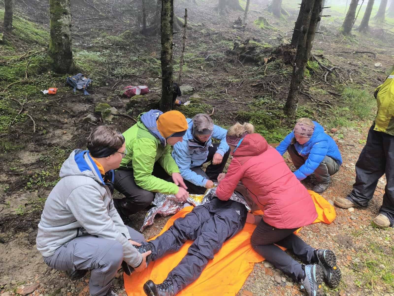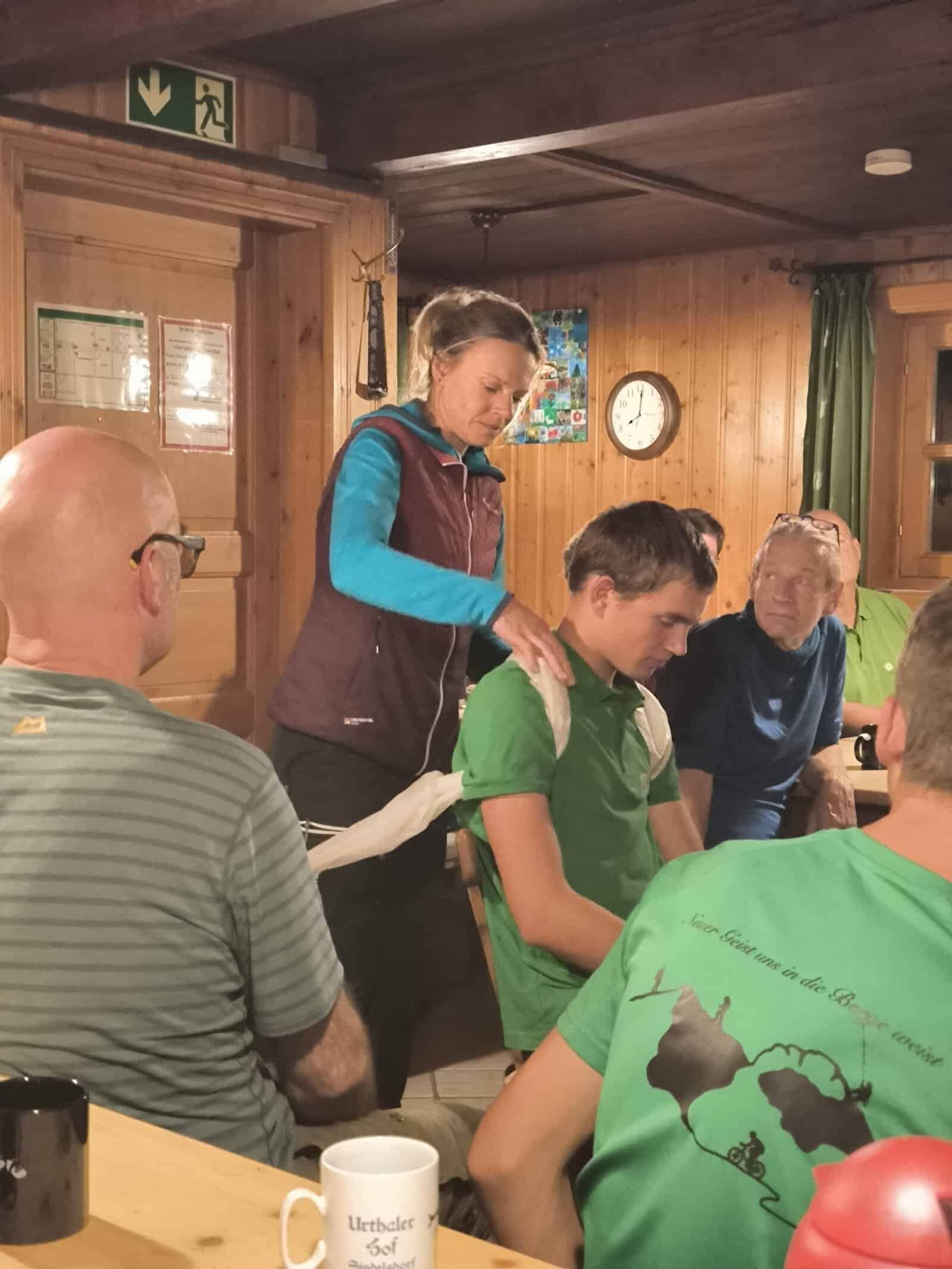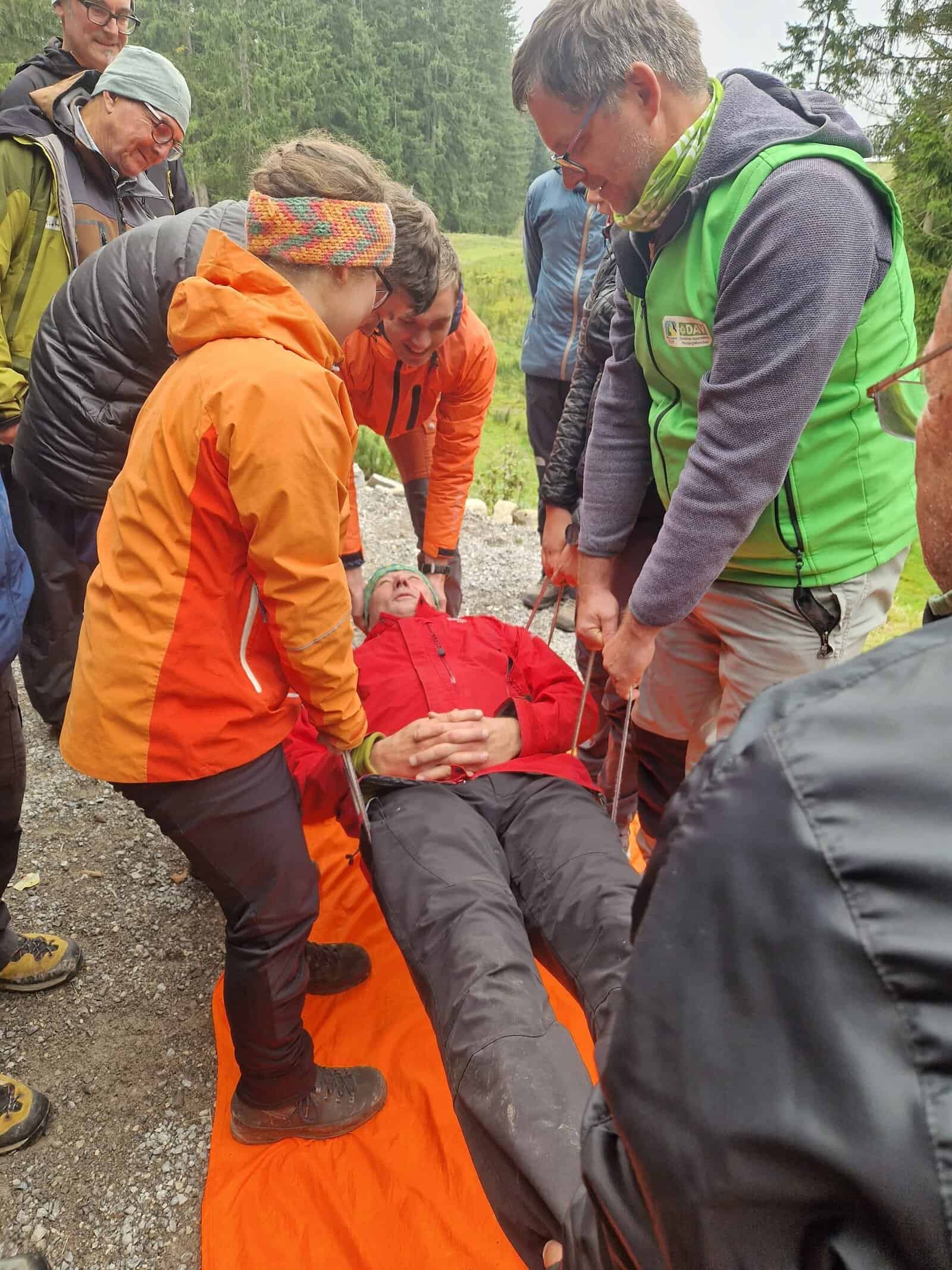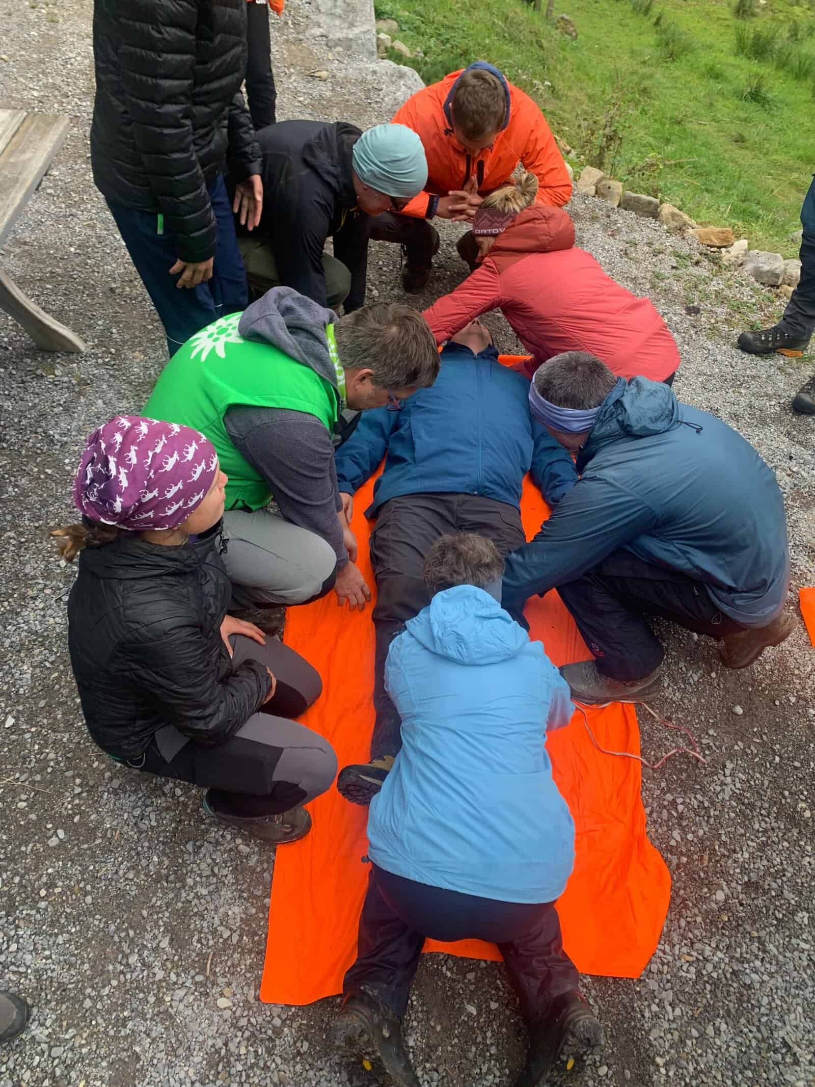 Am Samstag um 9.00 Uhr ging´s in 2 Gruppen los mit der Priorisierung von Gefahreneinschätzung, Selbst- und Gruppenschutz, Vorgehen je nach Bewusstseinslage des Verunglückten, Notruf, Ortung und Sicherung der Unglücksstelle. Danach übten wir den ganzen Tag in unterschiedlichen Rollen verschiedene Szenarien von Verletzungen bzw. Gehirnerschütterung nach Sturz und lernten dabei Bodycheck, verschiedene Tragetechniken, Schienungs- und Lagerungsmethoden, die Wichtigkeit des Wärmeerhalts des Verunglückten und diverse Verbände. Hier zeigte sich, wie wertvoll klare Kommunikation innerhalb der Gruppe und das Delegieren von Aufgaben ist.
