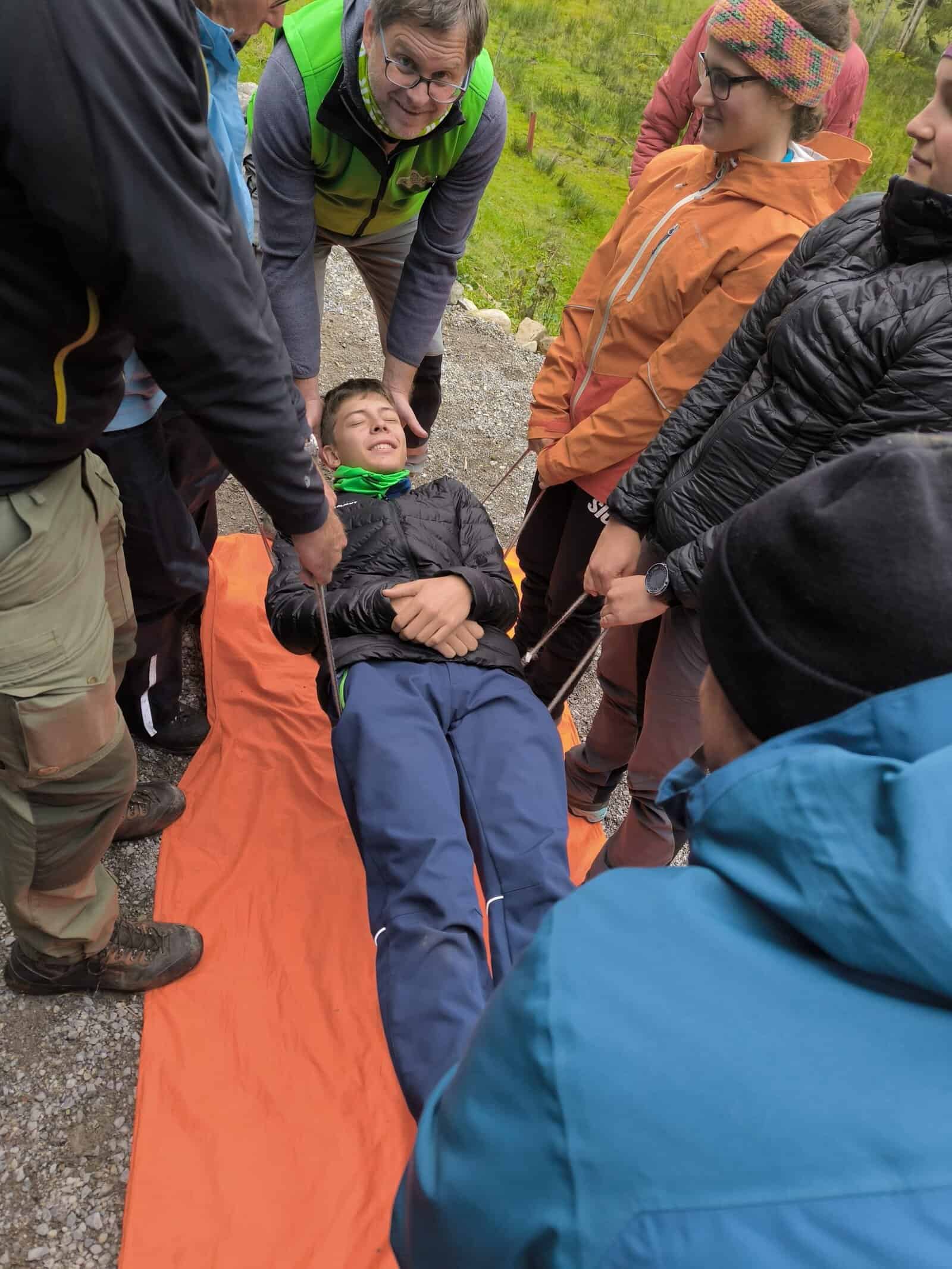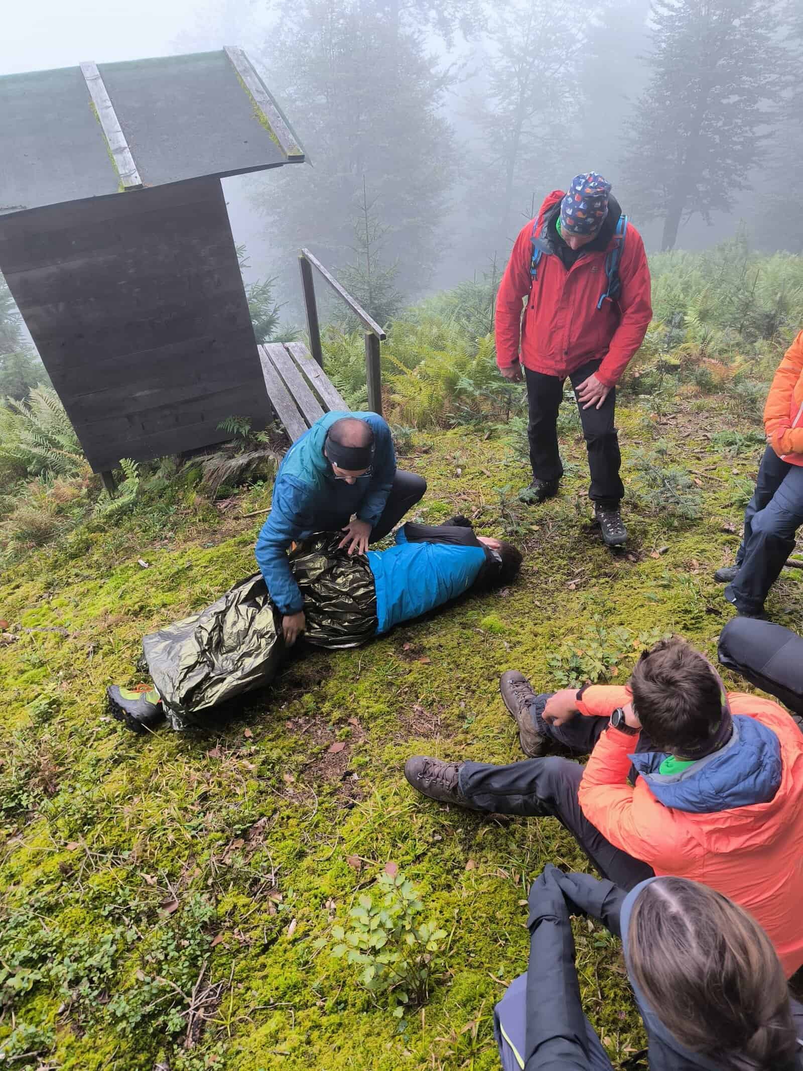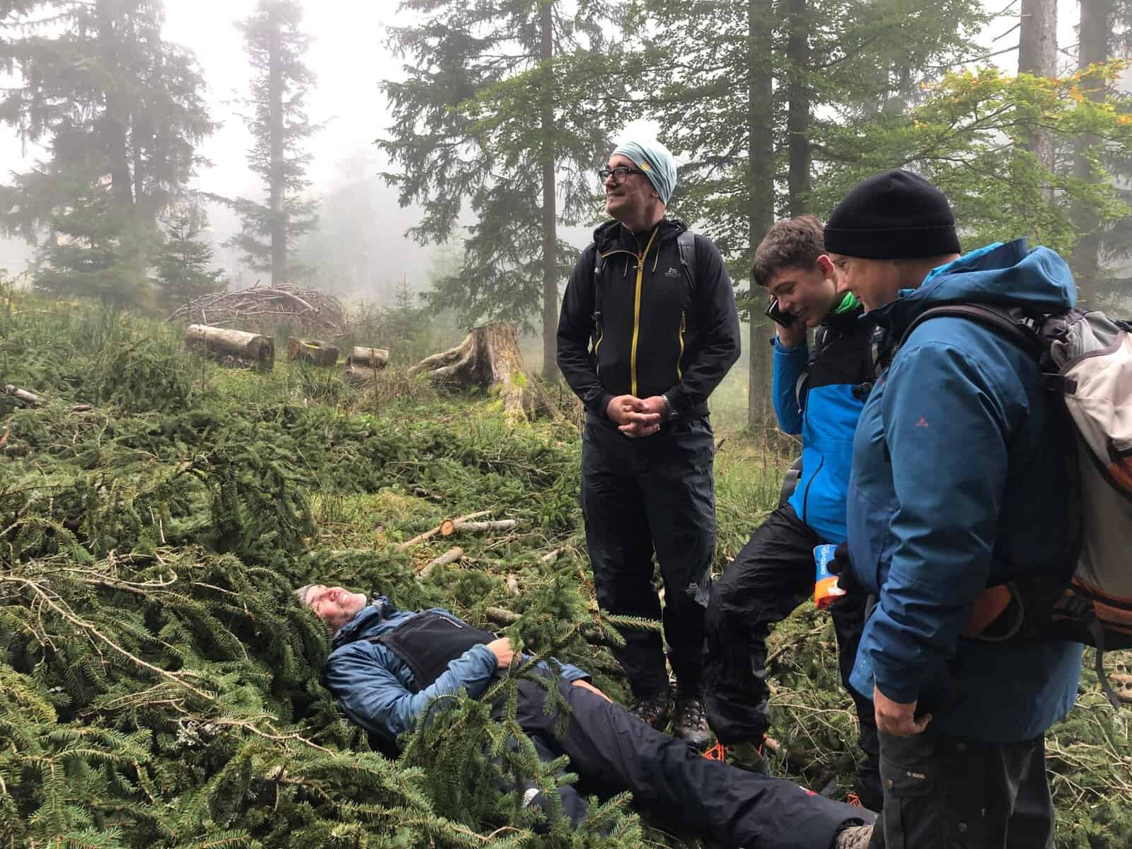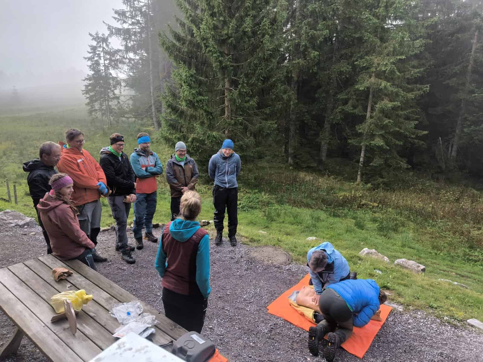Am Samstag um 9.00 Uhr ging´s in 2 Gruppen los mit der Priorisierung von Gefahreneinschätzung, Selbst- und Gruppenschutz, Vorgehen je nach Bewusstseinslage des Verunglückten, Notruf, Ortung und Sicherung der Unglücksstelle. Danach übten wir den ganzen Tag in unterschiedlichen Rollen verschiedene Szenarien von Verletzungen bzw. Gehirnerschütterung nach Sturz und lernten dabei Bodycheck, verschiedene Tragetechniken, Schienungs- und Lagerungsmethoden, die Wichtigkeit des Wärmeerhalts des Verunglückten und diverse Verbände. Hier zeigte sich, wie wertvoll klare Kommunikation innerhalb der Gruppe und das Delegieren von Aufgaben ist.