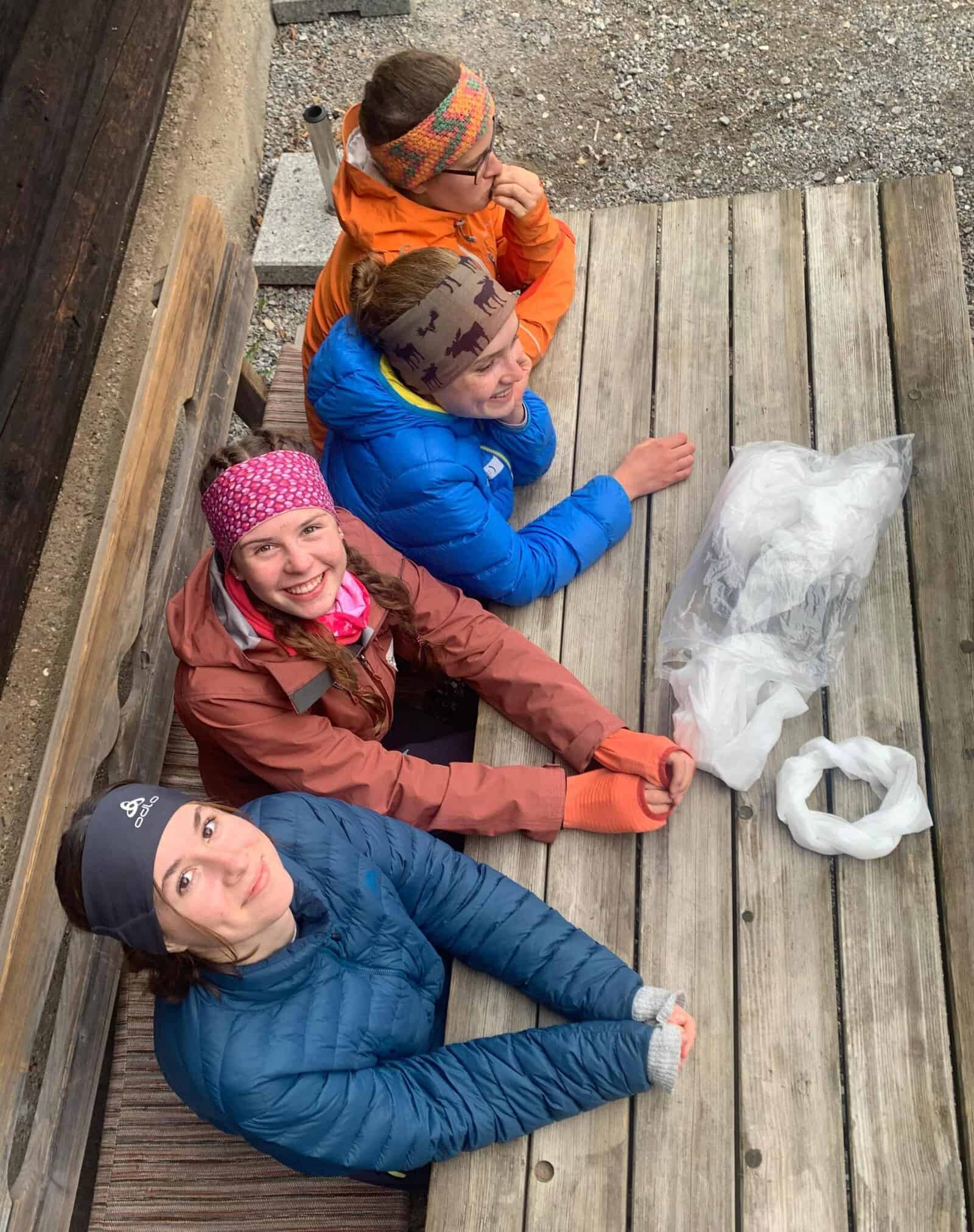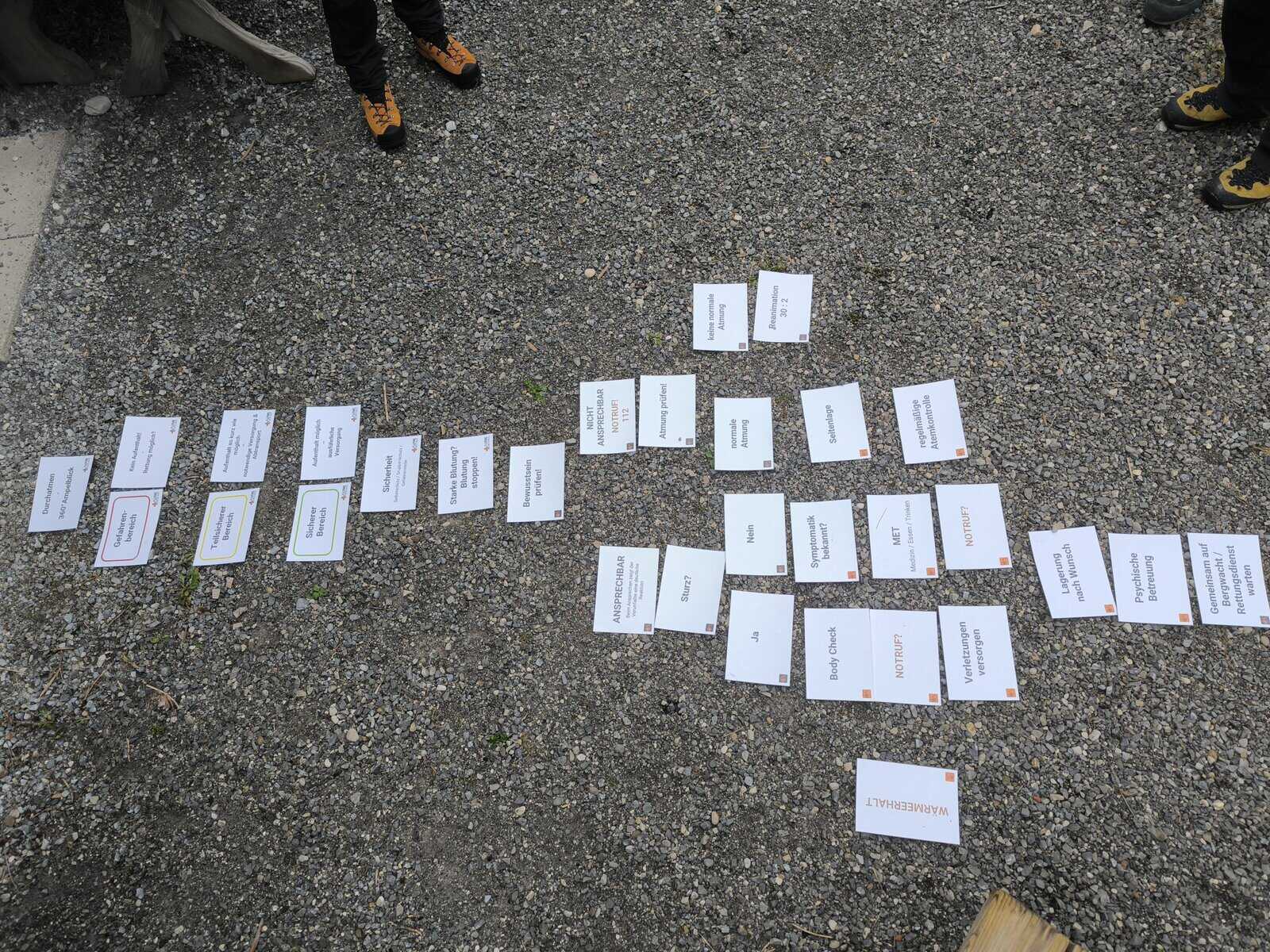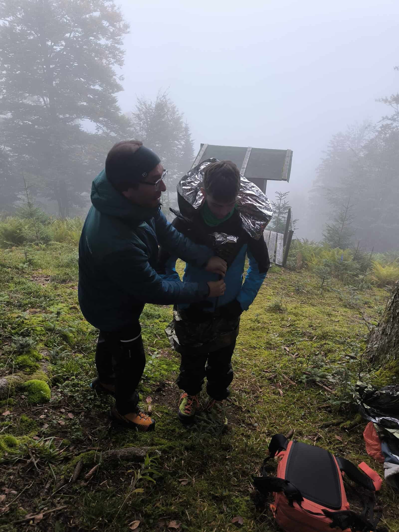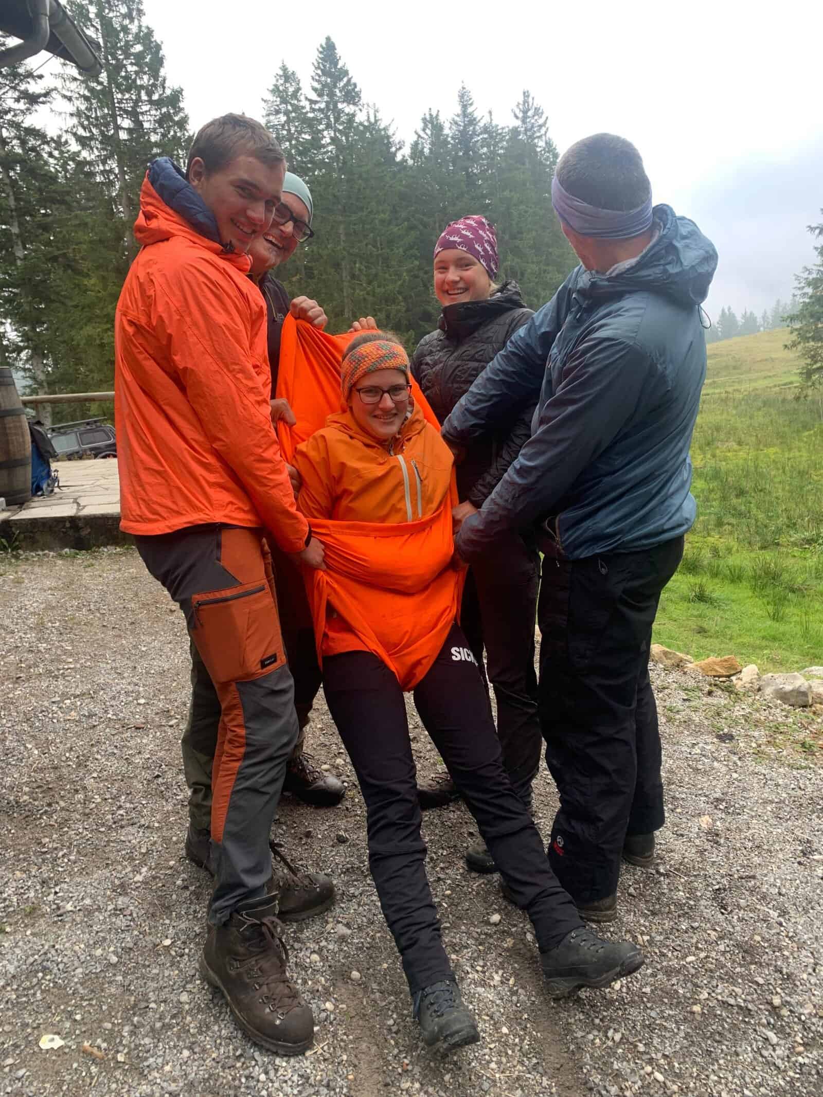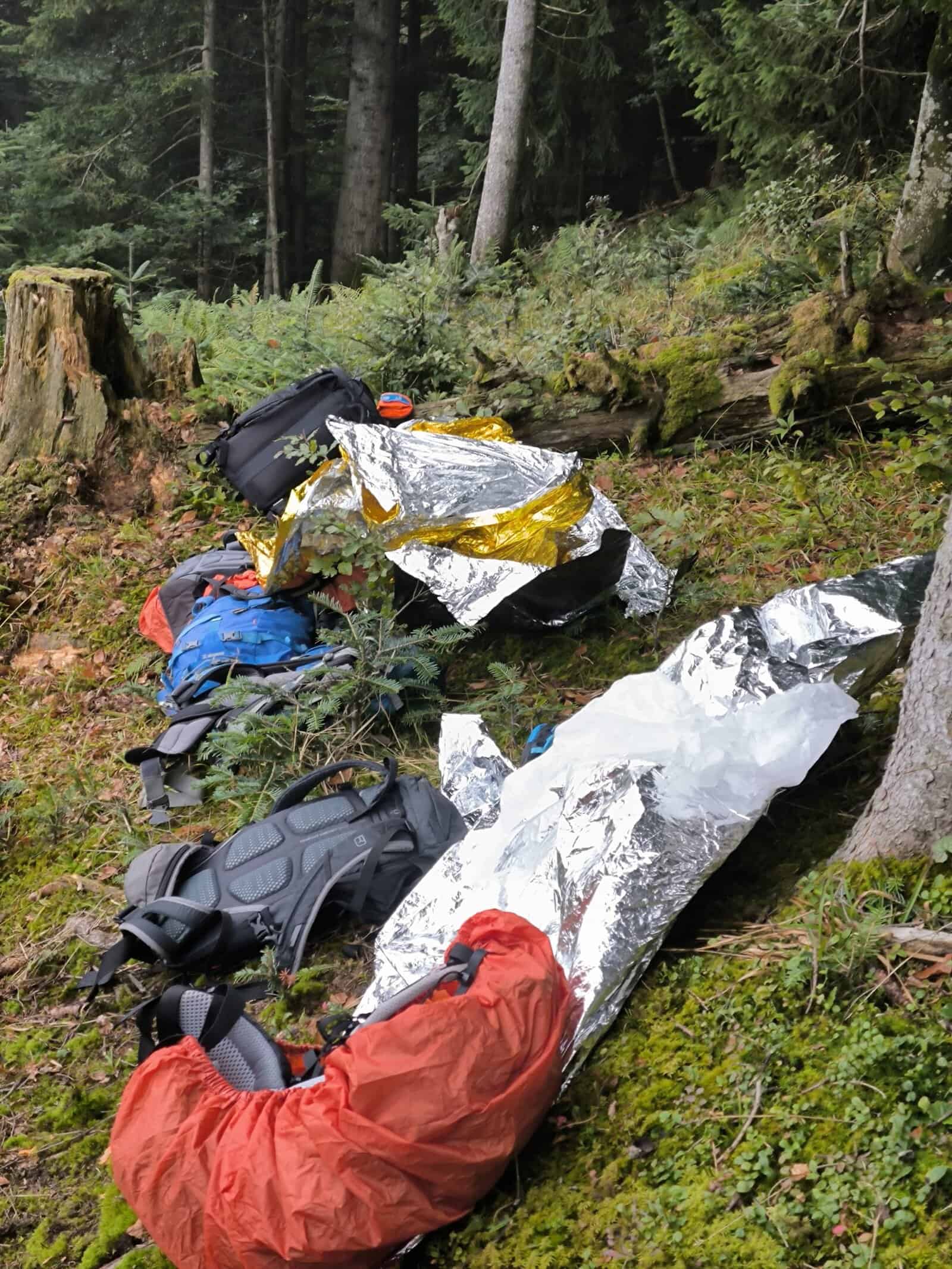 Am Samstag um 9.00 Uhr ging´s in 2 Gruppen los mit der Priorisierung von Gefahreneinschätzung, Selbst- und Gruppenschutz, Vorgehen je nach Bewusstseinslage des Verunglückten, Notruf, Ortung und Sicherung der Unglücksstelle. Danach übten wir den ganzen Tag in unterschiedlichen Rollen verschiedene Szenarien von Verletzungen bzw. Gehirnerschütterung nach Sturz und lernten dabei Bodycheck, verschiedene Tragetechniken, Schienungs- und Lagerungsmethoden, die Wichtigkeit des Wärmeerhalts des Verunglückten und diverse Verbände. Hier zeigte sich, wie wertvoll klare Kommunikation innerhalb der Gruppe und das Delegieren von Aufgaben ist.