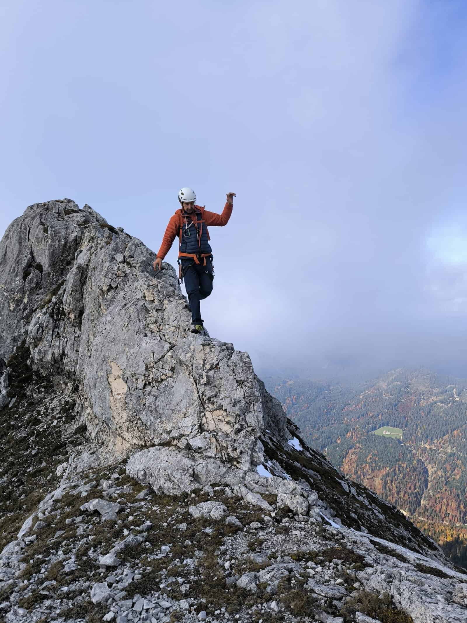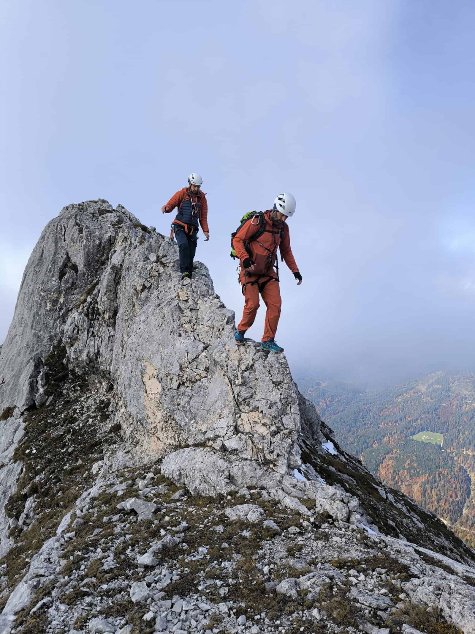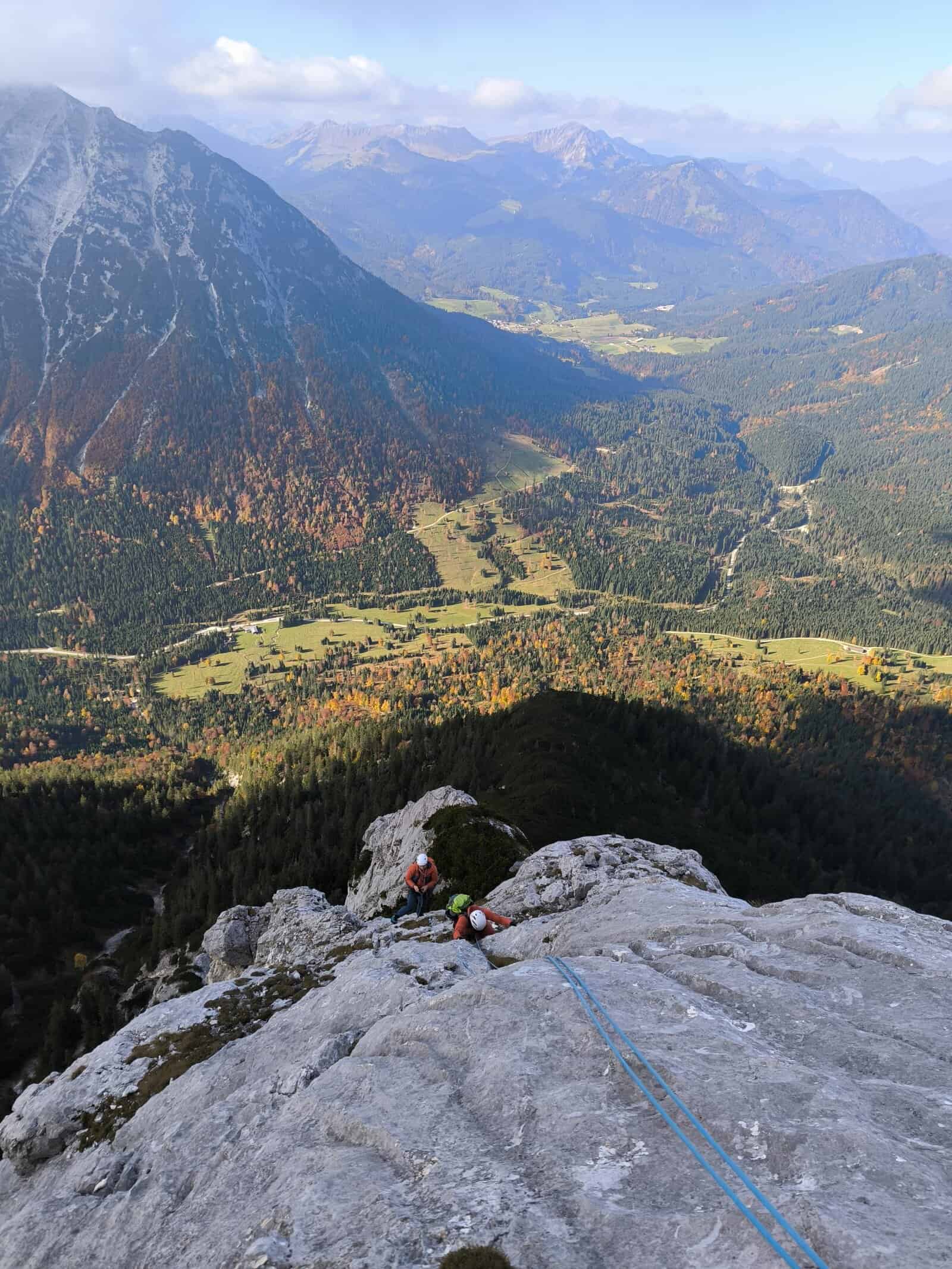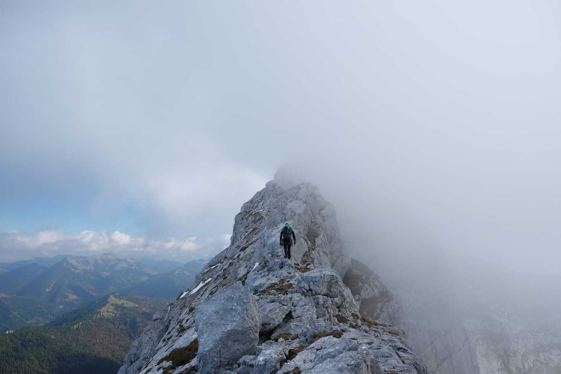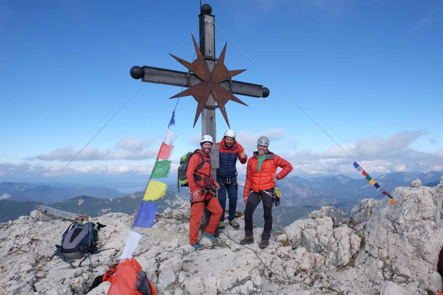 Zu dritt ging’s am 18.10.2025 übern Guffert. Entgegen den üblichen Tourenbeschreibungen, welche von Steinberg aus starten, orientierten wir uns beim Zustieg an einer kürzlich erkundeten und im www veröffentlichten (großen Dank dafür) Alternative. Diese versprach – bösartige Runsen und lästigen Latschenkampf vermeidend – ein bequemeres und zügigeres Erreichen des Westgrats. Also ging es am PP Waldfrieden los und nach etwas Wanderweg, etwas mehr weglosem Steigen durch Wald, Rinne und überschaubar wenig Latschen erreichten wir ohne Eile schon nach 2h den Westgrat. Vor dem Einstieg machten wir kurz Rast und legten vorsorglich das Klettergeraffel an. Der erste Abschnitt führte uns zum Warmklettern in gutem Fels (bis III) luftig bis zum Beginn der Sportklettervariante. Diese, 2 Seillängen lange Variante, weist eine Stelle 6- auf, welche gut mit Bohrhaken gesichert ist. Also Seil dran, Kletterschuhe an und nach 2x30m standen wir schon am Ende dieser kurzweiligen Passage. Leider war es nun ziemlich frisch, auch mangels Sonne, und wir waren froh Kletterschuhe und Seil wieder wegpacken und den Schritt wieder beschleunigen zu können. Von tiefhängenden Wolken begleitet, mit Ausblicken in die Abgründe links und rechts, stiegen und balancierten wir den schönen Grat, mal gemütlich, mal steil und ausgesetzt weiter hinauf und erreichten schließlich den Westgipfel des Guffert. Während der Gipfelbrotzeit öffneten sich die Wolken etwas gen Norden und auch die Sonne zeigte sich, das ließ hoffen. Wir folgten anschließend dem Grat weiter bis zum Abbruch in die Scharte zwischen West- und Ostgipfel. In diese sicherten wir noch kurz hinunter und erreichten dann über schönes Kraxlgelände den Haupt(Ost)gipfel des Guffert. Die Wolken hatten sich nun weitestgehend aufgelöst und wir konnten bei guter Aussicht, den Gipfelschnaps (Lob an Frischi) genießen. Nachdem wir nochmal ausreichend mentale Kraft für den nicht gerade knieschonenden Abstieg gesammelt hatten, ging es schließlich warm und sonnig nach Steinberg hinunter. Zuletzt brachte uns das dort abgestellte Auto wieder zum Ausgangspunkt der Tour.