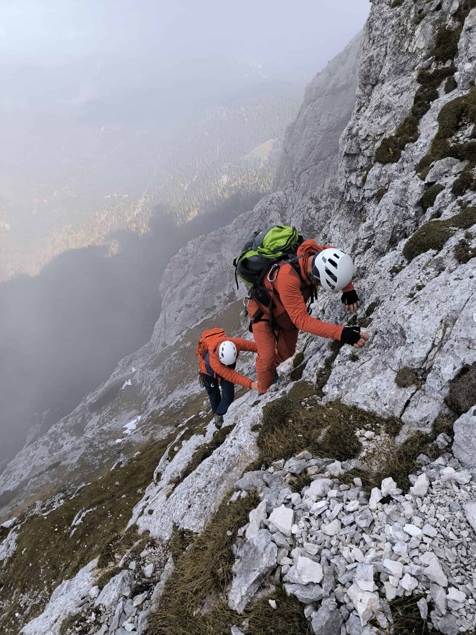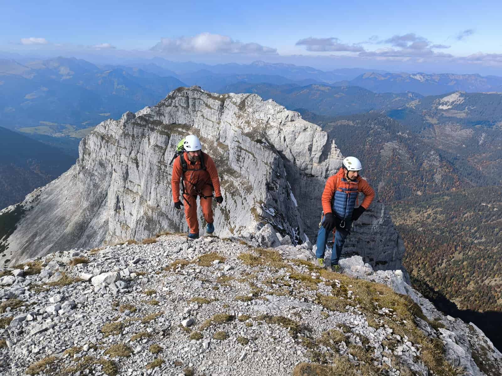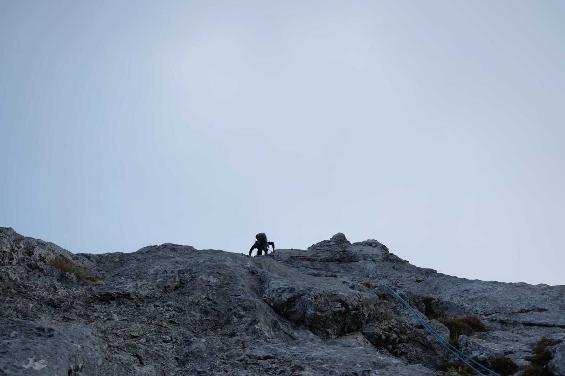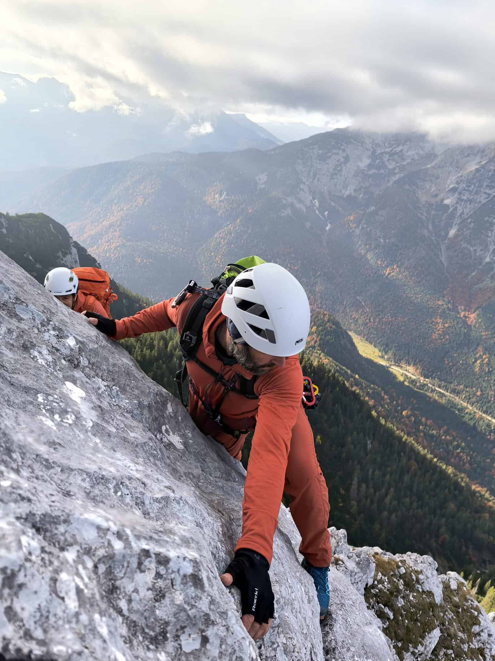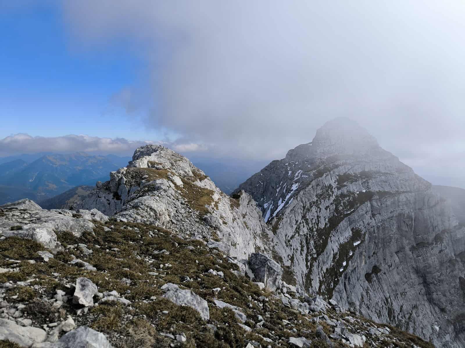 Zu dritt ging’s am 18.10.2025 übern Guffert. Entgegen den üblichen Tourenbeschreibungen, welche von Steinberg aus starten, orientierten wir uns beim Zustieg an einer kürzlich erkundeten und im www veröffentlichten (großen Dank dafür) Alternative. Diese versprach – bösartige Runsen und lästigen Latschenkampf vermeidend – ein bequemeres und zügigeres Erreichen des Westgrats. Also ging es am PP Waldfrieden los und nach etwas Wanderweg, etwas mehr weglosem Steigen durch Wald, Rinne und überschaubar wenig Latschen erreichten wir ohne Eile schon nach 2h den Westgrat. Vor dem Einstieg machten wir kurz Rast und legten vorsorglich das Klettergeraffel an. Der erste Abschnitt führte uns zum Warmklettern in gutem Fels (bis III) luftig bis zum Beginn der Sportklettervariante. Diese, 2 Seillängen lange Variante, weist eine Stelle 6- auf, welche gut mit Bohrhaken gesichert ist. Also Seil dran, Kletterschuhe an und nach 2x30m standen wir schon am Ende dieser kurzweiligen Passage. Leider war es nun ziemlich frisch, auch mangels Sonne, und wir waren froh Kletterschuhe und Seil wieder wegpacken und den Schritt wieder beschleunigen zu können. Von tiefhängenden Wolken begleitet, mit Ausblicken in die Abgründe links und rechts, stiegen und balancierten wir den schönen Grat, mal gemütlich, mal steil und ausgesetzt weiter hinauf und erreichten schließlich den Westgipfel des Guffert. Während der Gipfelbrotzeit öffneten sich die Wolken etwas gen Norden und auch die Sonne zeigte sich, das ließ hoffen. Wir folgten anschließend dem Grat weiter bis zum Abbruch in die Scharte zwischen West- und Ostgipfel. In diese sicherten wir noch kurz hinunter und erreichten dann über schönes Kraxlgelände den Haupt(Ost)gipfel des Guffert. Die Wolken hatten sich nun weitestgehend aufgelöst und wir konnten bei guter Aussicht, den Gipfelschnaps (Lob an Frischi) genießen. Nachdem wir nochmal ausreichend mentale Kraft für den nicht gerade knieschonenden Abstieg gesammelt hatten, ging es schließlich warm und sonnig nach Steinberg hinunter. Zuletzt brachte uns das dort abgestellte Auto wieder zum Ausgangspunkt der Tour.