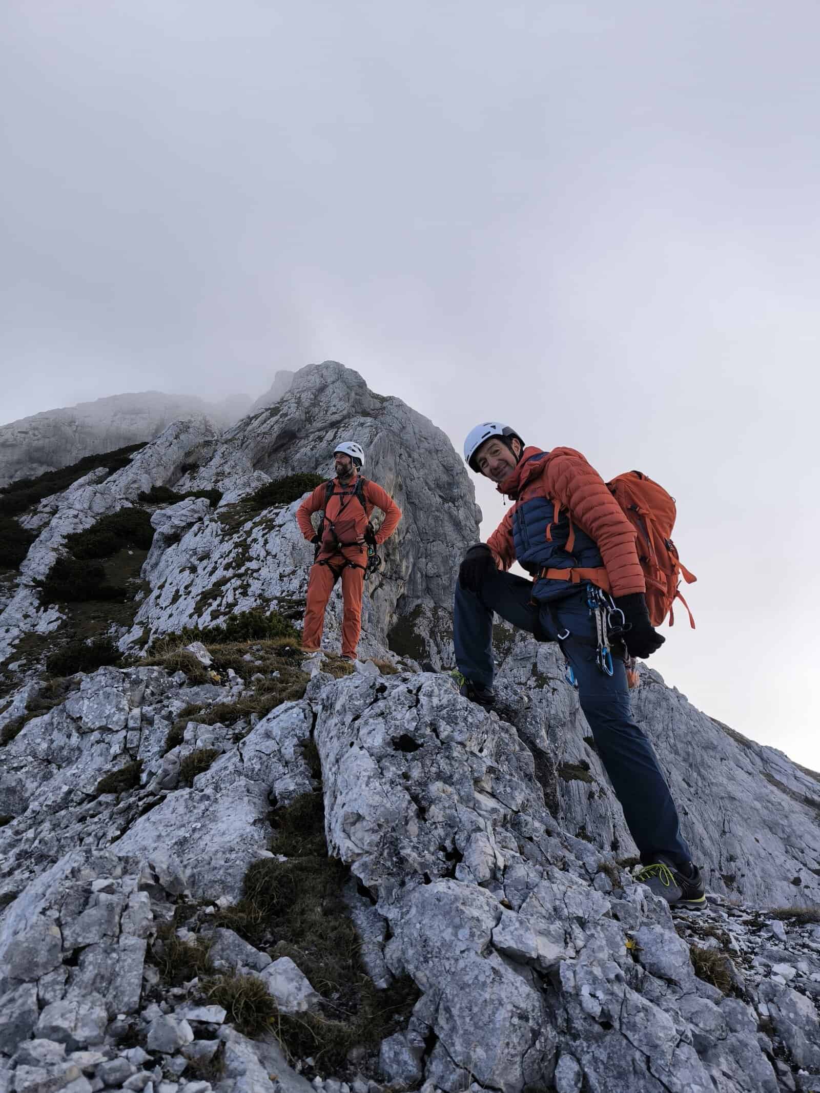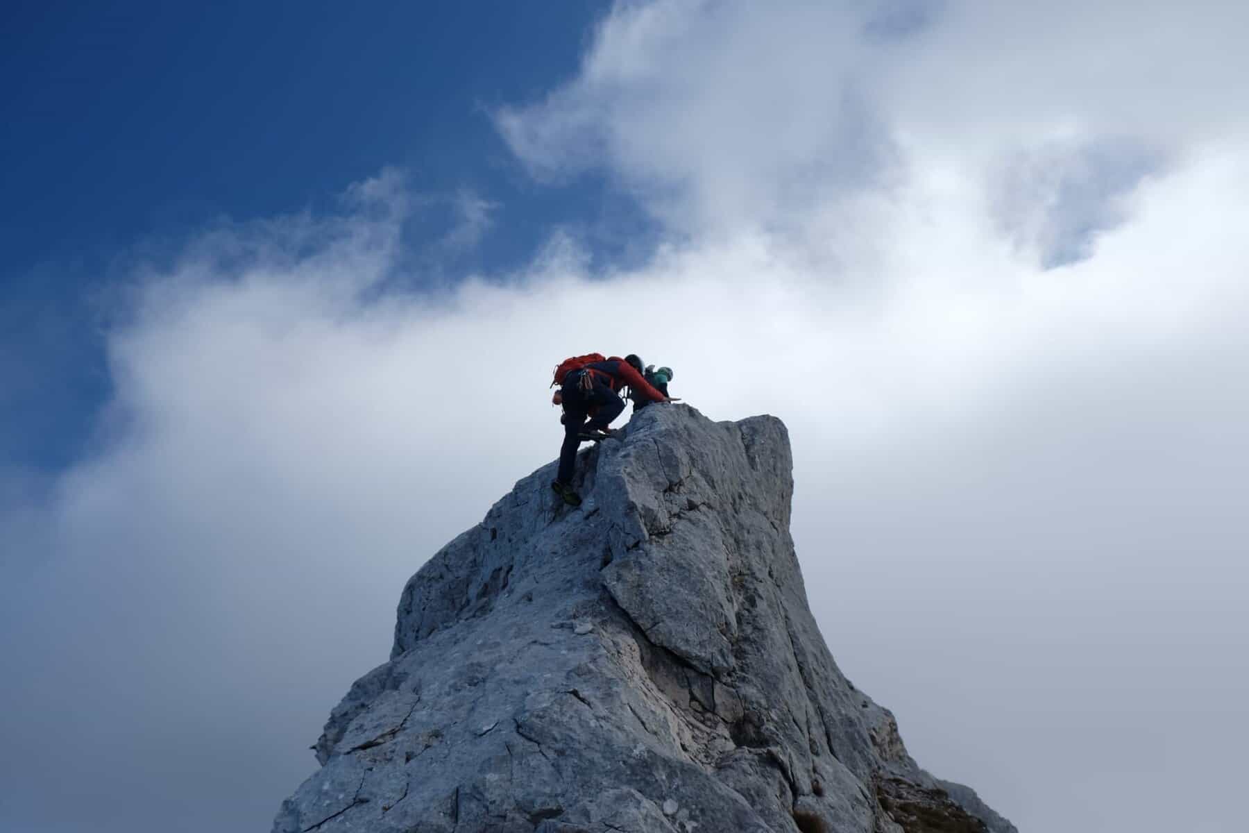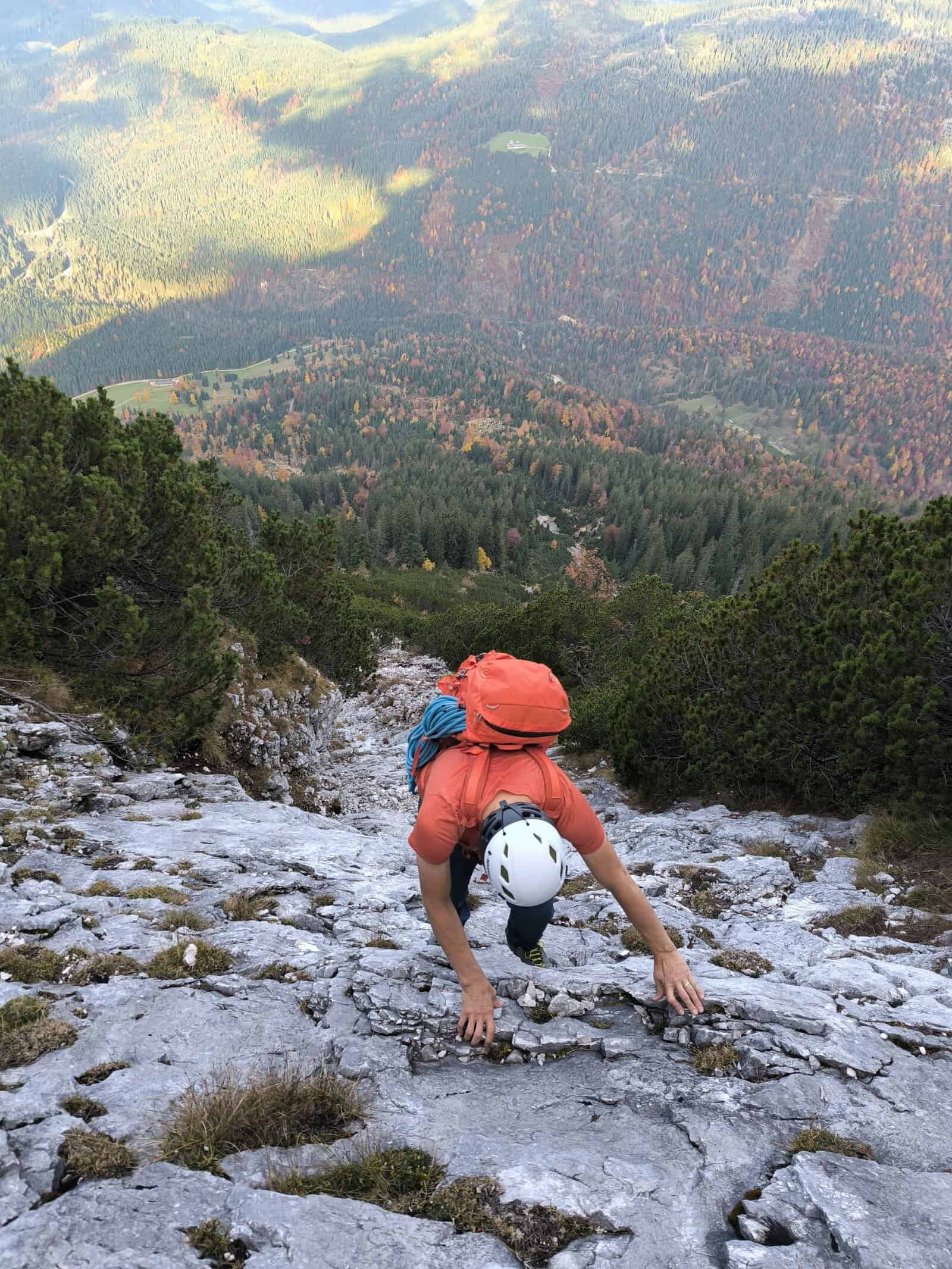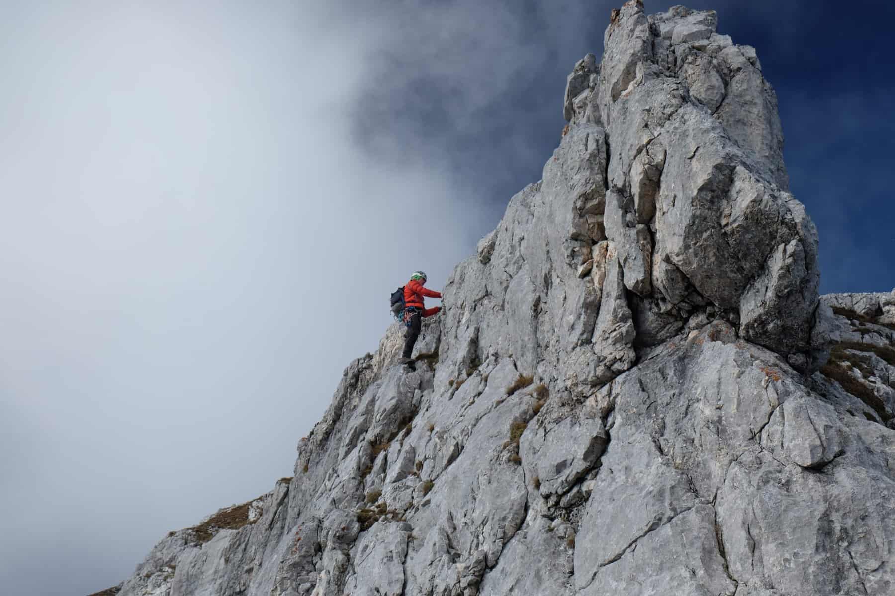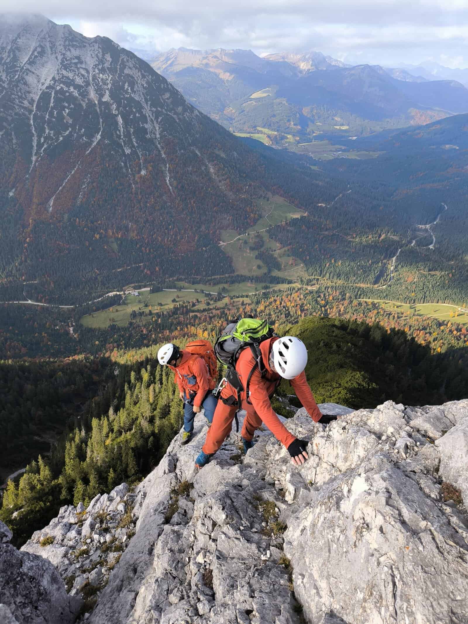 Zu dritt ging’s am 18.10.2025 übern Guffert. Entgegen den üblichen Tourenbeschreibungen, welche von Steinberg aus starten, orientierten wir uns beim Zustieg an einer kürzlich erkundeten und im www veröffentlichten (großen Dank dafür) Alternative. Diese versprach – bösartige Runsen und lästigen Latschenkampf vermeidend – ein bequemeres und zügigeres Erreichen des Westgrats. Also ging es am PP Waldfrieden los und nach etwas Wanderweg, etwas mehr weglosem Steigen durch Wald, Rinne und überschaubar wenig Latschen erreichten wir ohne Eile schon nach 2h den Westgrat. Vor dem Einstieg machten wir kurz Rast und legten vorsorglich das Klettergeraffel an. Der erste Abschnitt führte uns zum Warmklettern in gutem Fels (bis III) luftig bis zum Beginn der Sportklettervariante. Diese, 2 Seillängen lange Variante, weist eine Stelle 6- auf, welche gut mit Bohrhaken gesichert ist. Also Seil dran, Kletterschuhe an und nach 2x30m standen wir schon am Ende dieser kurzweiligen Passage. Leider war es nun ziemlich frisch, auch mangels Sonne, und wir waren froh Kletterschuhe und Seil wieder wegpacken und den Schritt wieder beschleunigen zu können. Von tiefhängenden Wolken begleitet, mit Ausblicken in die Abgründe links und rechts, stiegen und balancierten wir den schönen Grat, mal gemütlich, mal steil und ausgesetzt weiter hinauf und erreichten schließlich den Westgipfel des Guffert. Während der Gipfelbrotzeit öffneten sich die Wolken etwas gen Norden und auch die Sonne zeigte sich, das ließ hoffen. Wir folgten anschließend dem Grat weiter bis zum Abbruch in die Scharte zwischen West- und Ostgipfel. In diese sicherten wir noch kurz hinunter und erreichten dann über schönes Kraxlgelände den Haupt(Ost)gipfel des Guffert. Die Wolken hatten sich nun weitestgehend aufgelöst und wir konnten bei guter Aussicht, den Gipfelschnaps (Lob an Frischi) genießen. Nachdem wir nochmal ausreichend mentale Kraft für den nicht gerade knieschonenden Abstieg gesammelt hatten, ging es schließlich warm und sonnig nach Steinberg hinunter. Zuletzt brachte uns das dort abgestellte Auto wieder zum Ausgangspunkt der Tour.