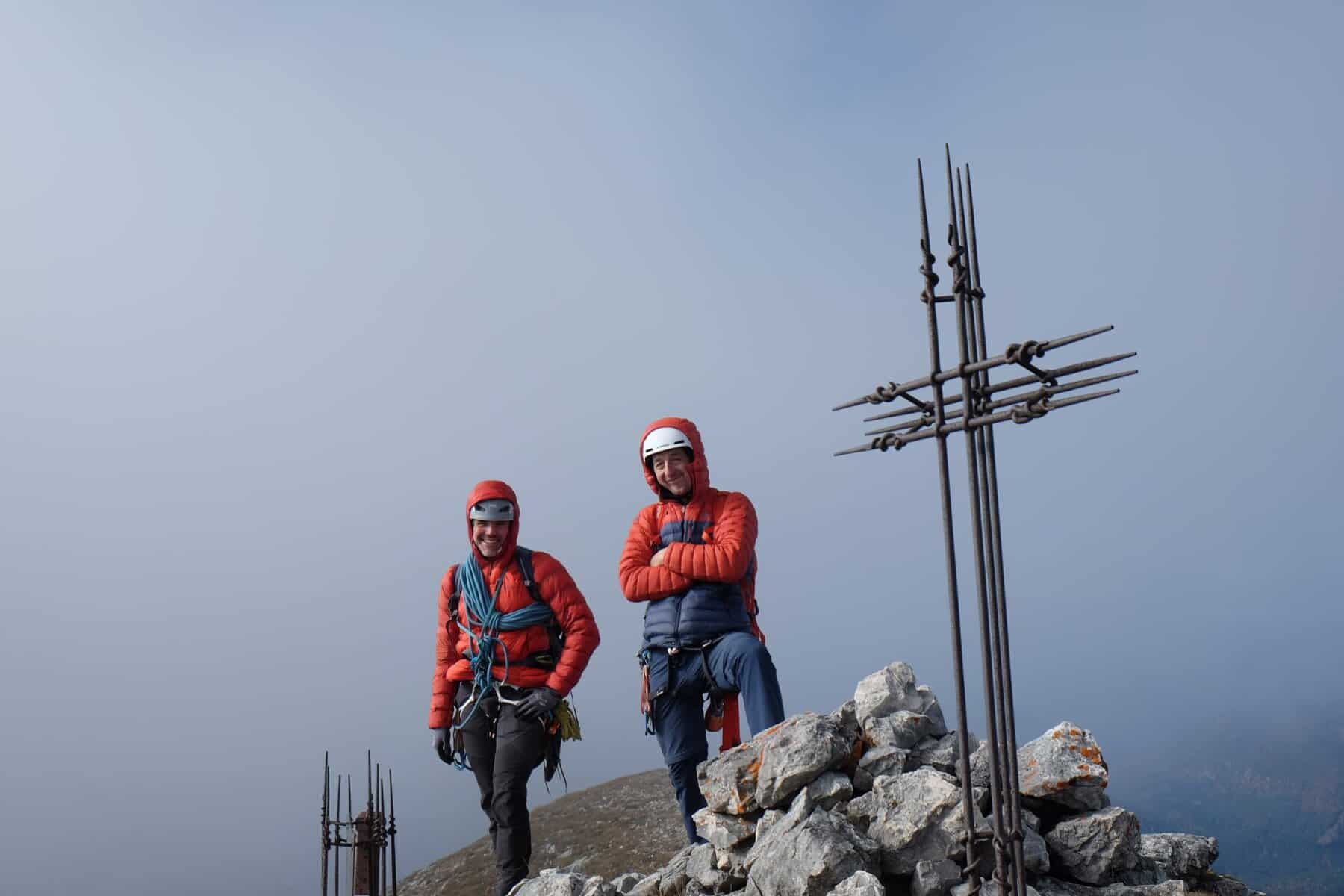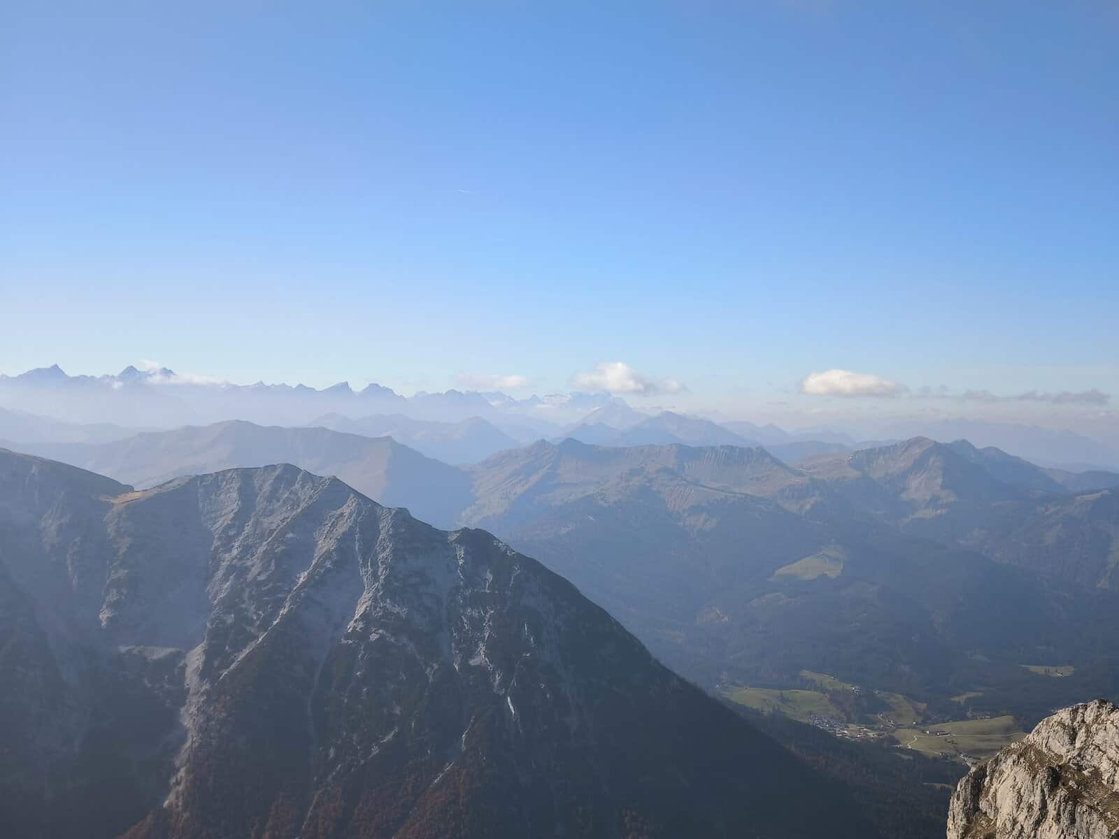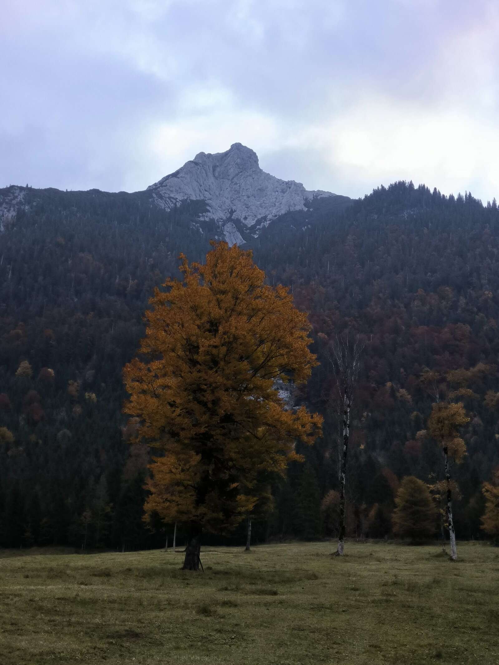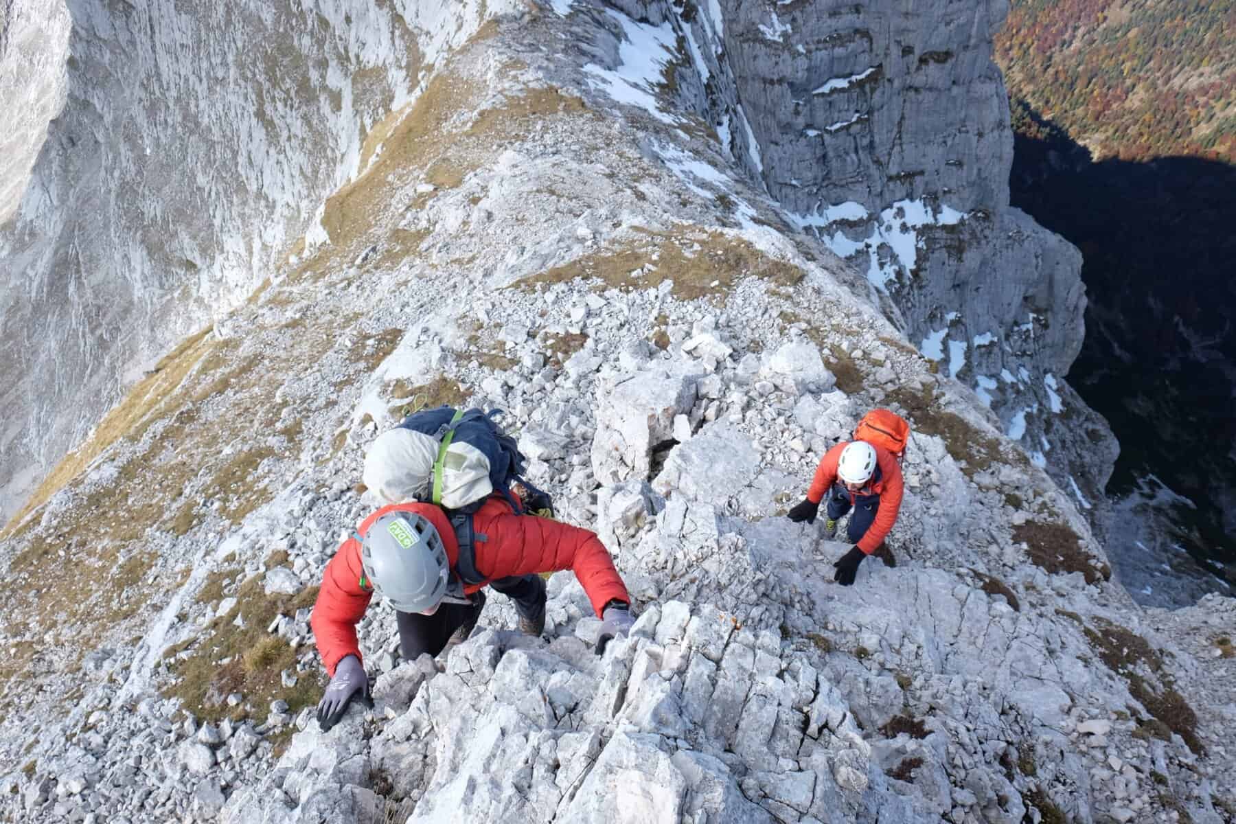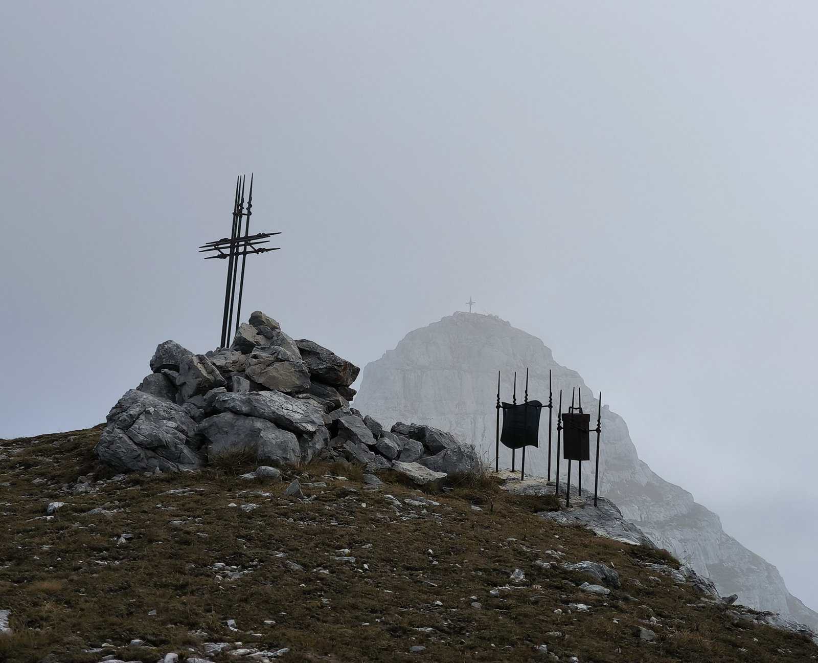 Zu dritt ging’s am 18.10.2025 übern Guffert. Entgegen den üblichen Tourenbeschreibungen, welche von Steinberg aus starten, orientierten wir uns beim Zustieg an einer kürzlich erkundeten und im www veröffentlichten (großen Dank dafür) Alternative. Diese versprach – bösartige Runsen und lästigen Latschenkampf vermeidend – ein bequemeres und zügigeres Erreichen des Westgrats. Also ging es am PP Waldfrieden los und nach etwas Wanderweg, etwas mehr weglosem Steigen durch Wald, Rinne und überschaubar wenig Latschen erreichten wir ohne Eile schon nach 2h den Westgrat. Vor dem Einstieg machten wir kurz Rast und legten vorsorglich das Klettergeraffel an. Der erste Abschnitt führte uns zum Warmklettern in gutem Fels (bis III) luftig bis zum Beginn der Sportklettervariante. Diese, 2 Seillängen lange Variante, weist eine Stelle 6- auf, welche gut mit Bohrhaken gesichert ist. Also Seil dran, Kletterschuhe an und nach 2x30m standen wir schon am Ende dieser kurzweiligen Passage. Leider war es nun ziemlich frisch, auch mangels Sonne, und wir waren froh Kletterschuhe und Seil wieder wegpacken und den Schritt wieder beschleunigen zu können. Von tiefhängenden Wolken begleitet, mit Ausblicken in die Abgründe links und rechts, stiegen und balancierten wir den schönen Grat, mal gemütlich, mal steil und ausgesetzt weiter hinauf und erreichten schließlich den Westgipfel des Guffert. Während der Gipfelbrotzeit öffneten sich die Wolken etwas gen Norden und auch die Sonne zeigte sich, das ließ hoffen. Wir folgten anschließend dem Grat weiter bis zum Abbruch in die Scharte zwischen West- und Ostgipfel. In diese sicherten wir noch kurz hinunter und erreichten dann über schönes Kraxlgelände den Haupt(Ost)gipfel des Guffert. Die Wolken hatten sich nun weitestgehend aufgelöst und wir konnten bei guter Aussicht, den Gipfelschnaps (Lob an Frischi) genießen. Nachdem wir nochmal ausreichend mentale Kraft für den nicht gerade knieschonenden Abstieg gesammelt hatten, ging es schließlich warm und sonnig nach Steinberg hinunter. Zuletzt brachte uns das dort abgestellte Auto wieder zum Ausgangspunkt der Tour.