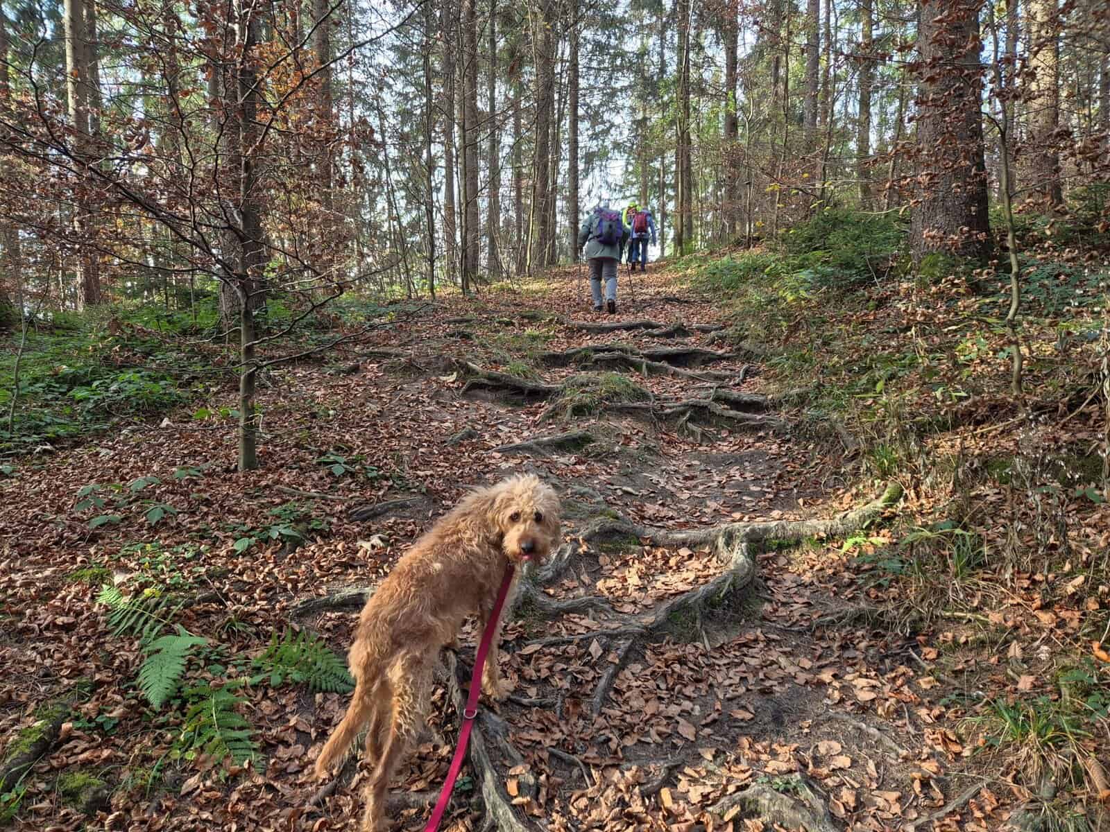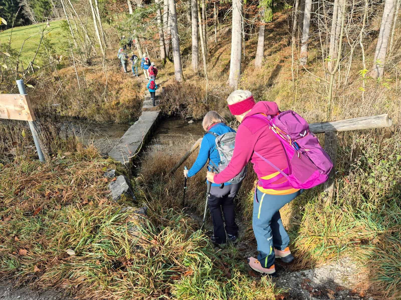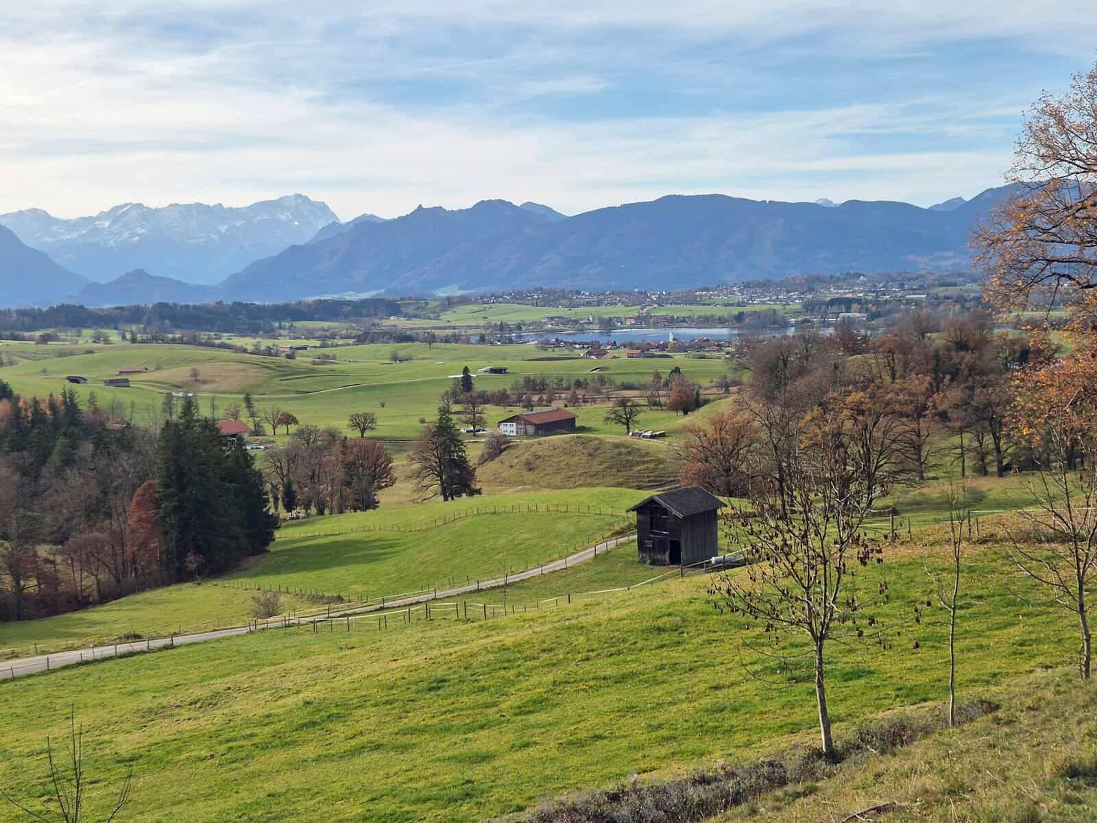Bei der Höhlmühle, wo wir unsere Autos parkten, mussten wir zunächst über eine schmale Betonbrücke ohne Geländer balancieren, was nicht ganz ungefährlich war. Danach führte ein Weg relativ steil bergauf durch den herbstliche Wald nach Westen. An der höchsten Stelle, dem Baumberg mit 870 m Höhe, konnte man durch die Bäume den Starnberger See schimmern sehen. Von hier aus ging es wieder sanft bergab, und als sich der Wald lichtete und wir die Aidlinger Höhe erreichten, bot sich uns ein phantastischer Blick über den Riegsee und die Voralpenkette. Bei einer längeren Pause genossen wir die herrliche Aussicht in vollen Zügen.