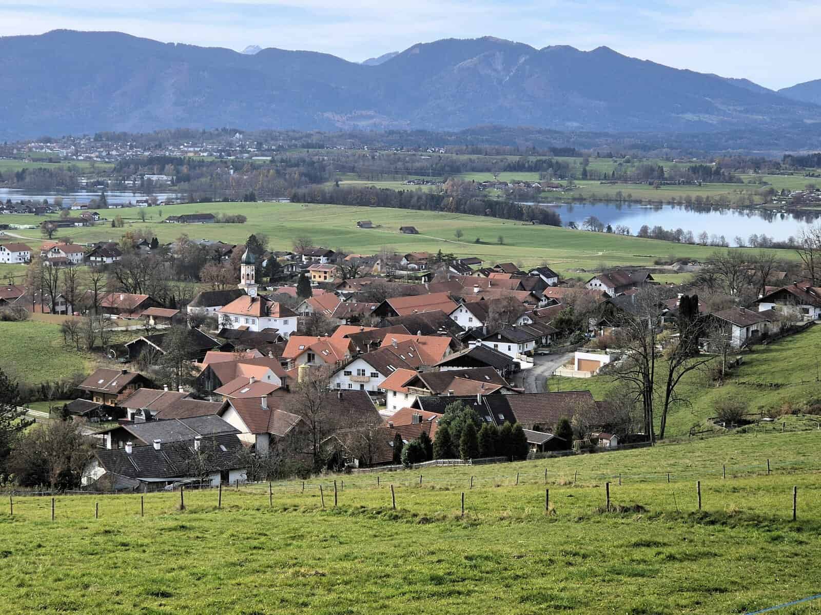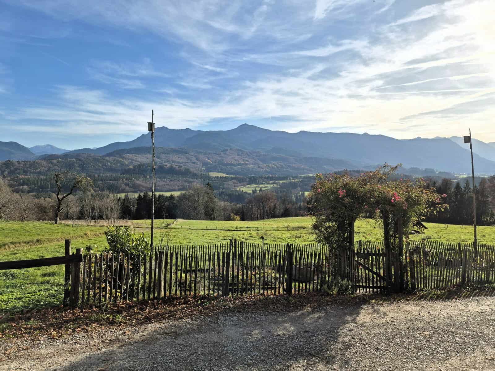 Von hier war es nur ein kurzes Stück bis zu dem hübschen Dorf Aidling. Im Ort wandten wir uns nach Osten und gelangten parallel zu dem Höhenrücken auf offenem Gelände immer mit Blick auf die Alpenkette zur Höhlmühle zurück.