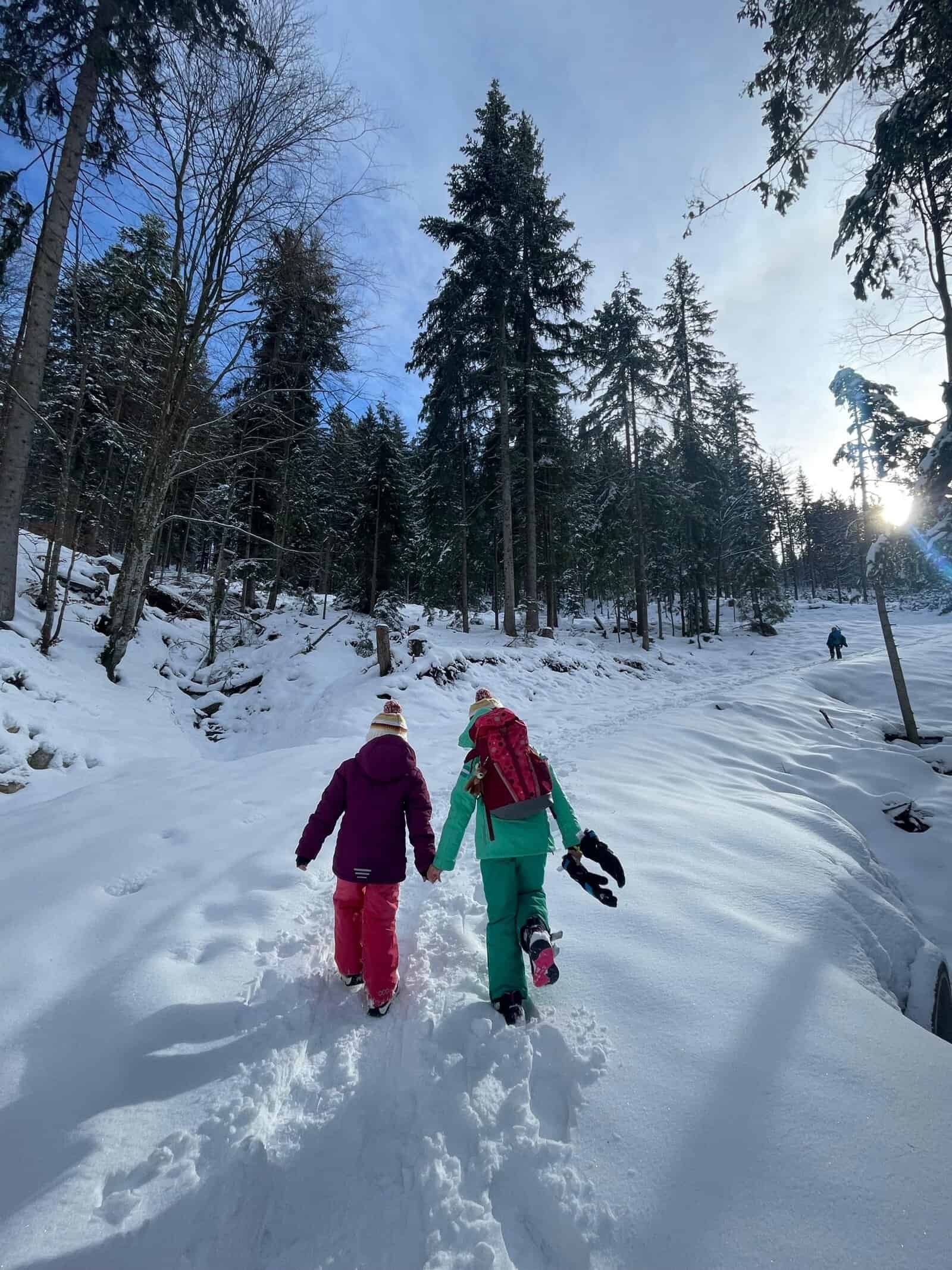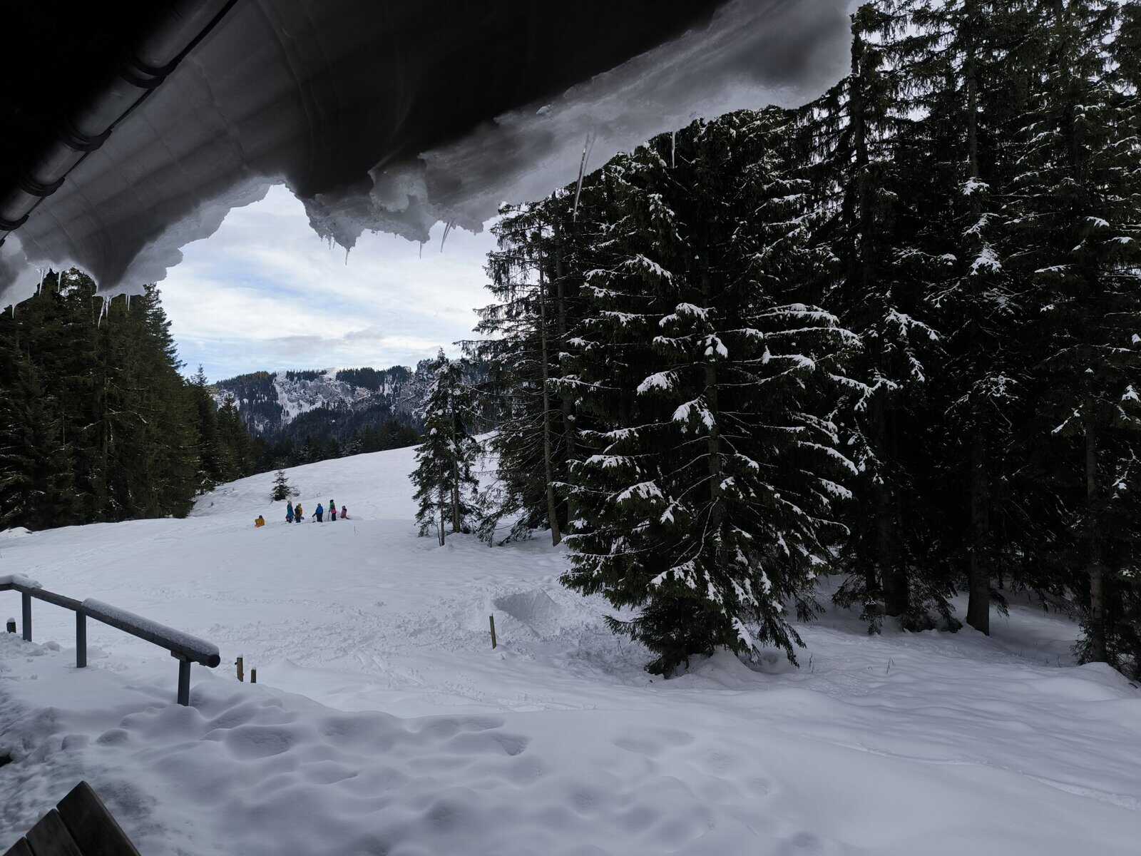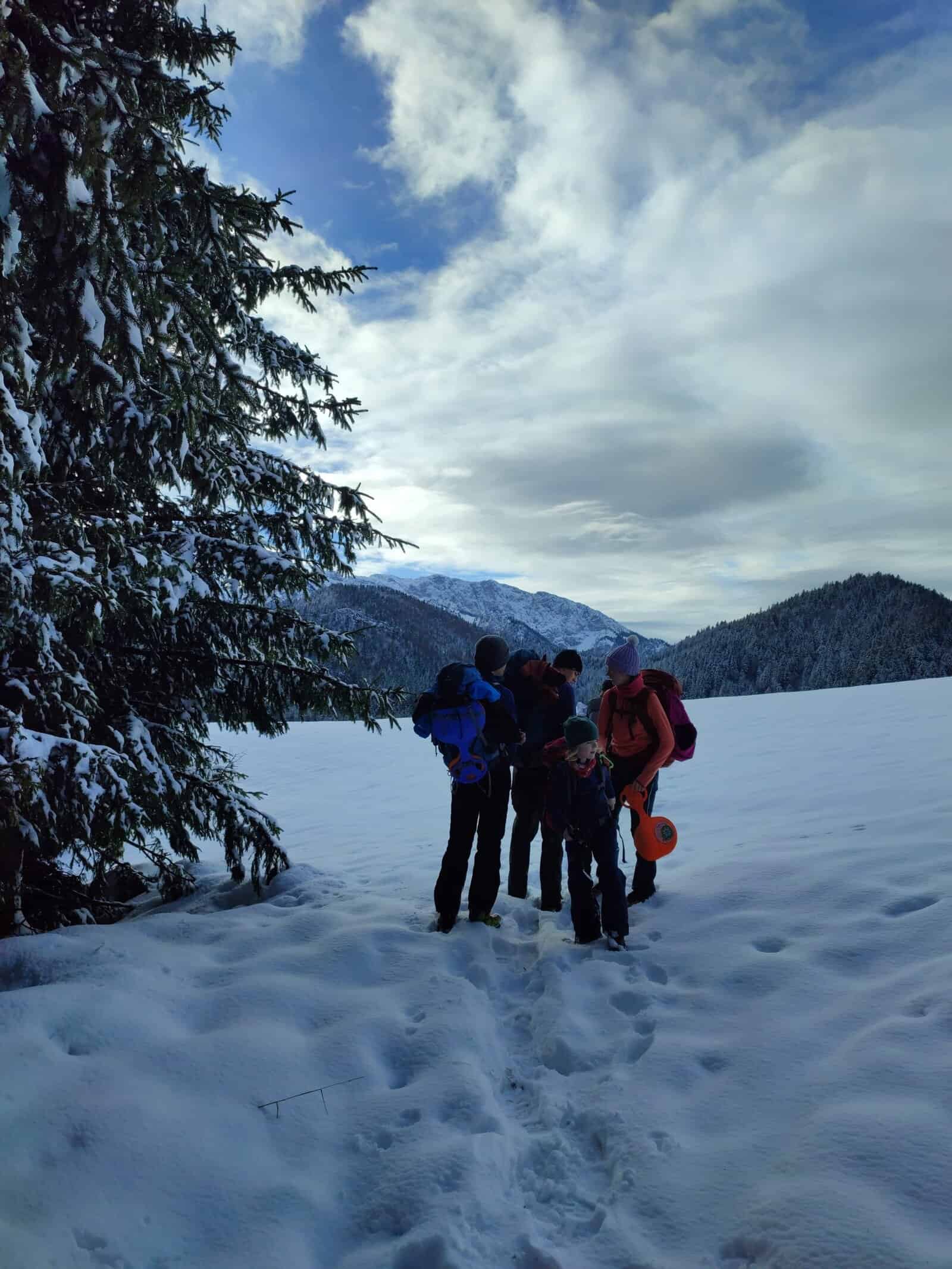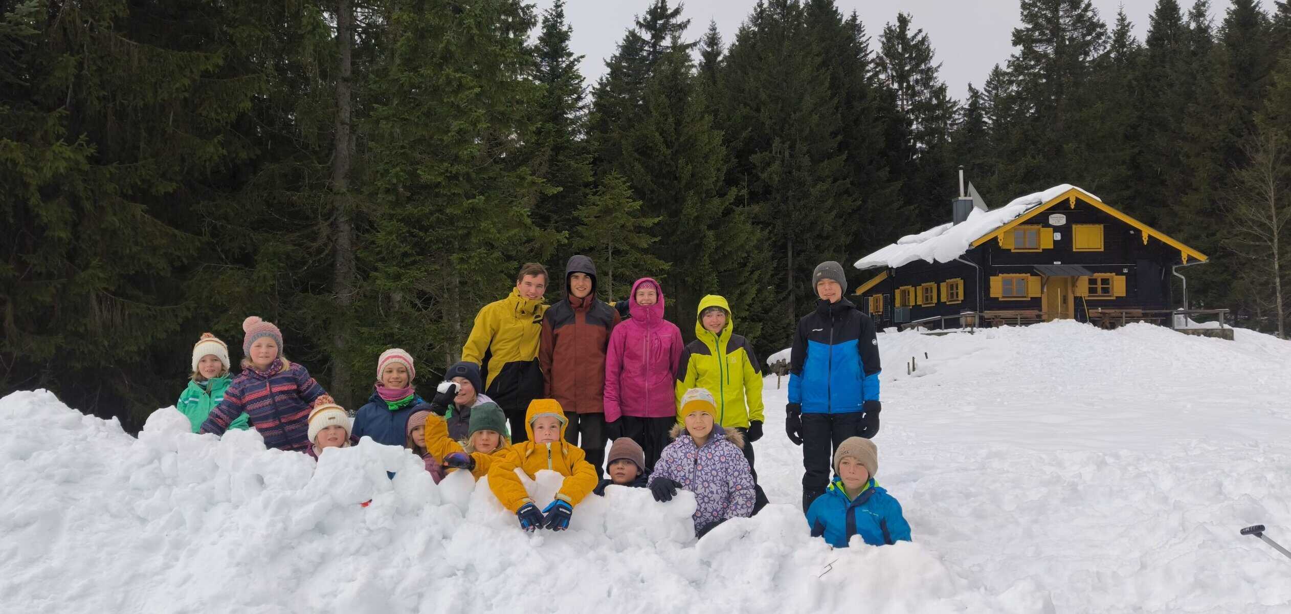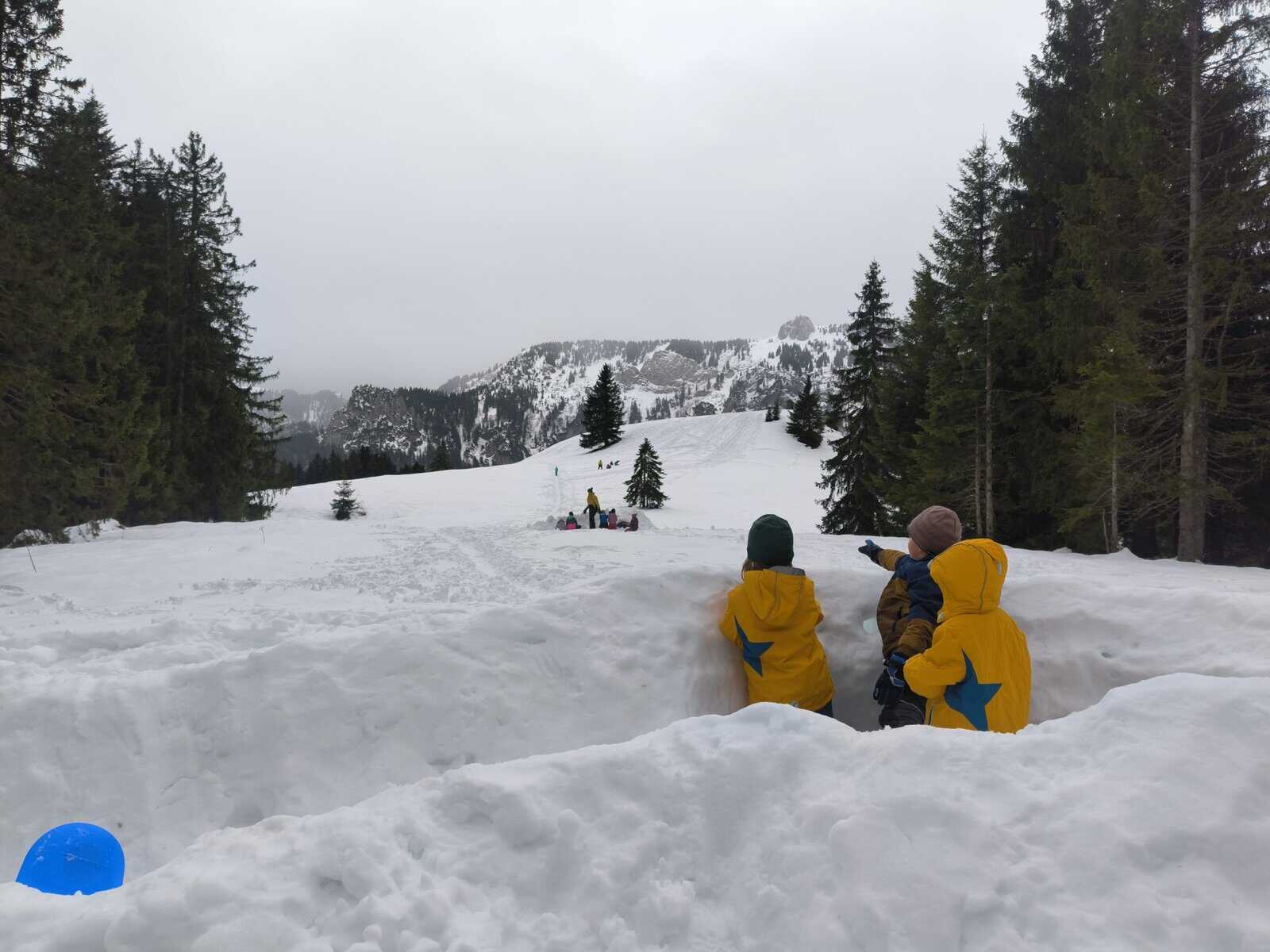 Nachdem wir in der schneebedeckten Hütte zu Mittag gegessen hatten, zog es einen Teil der Gruppe wieder nach draußen zum Iglubau und Poporutscherfahren.