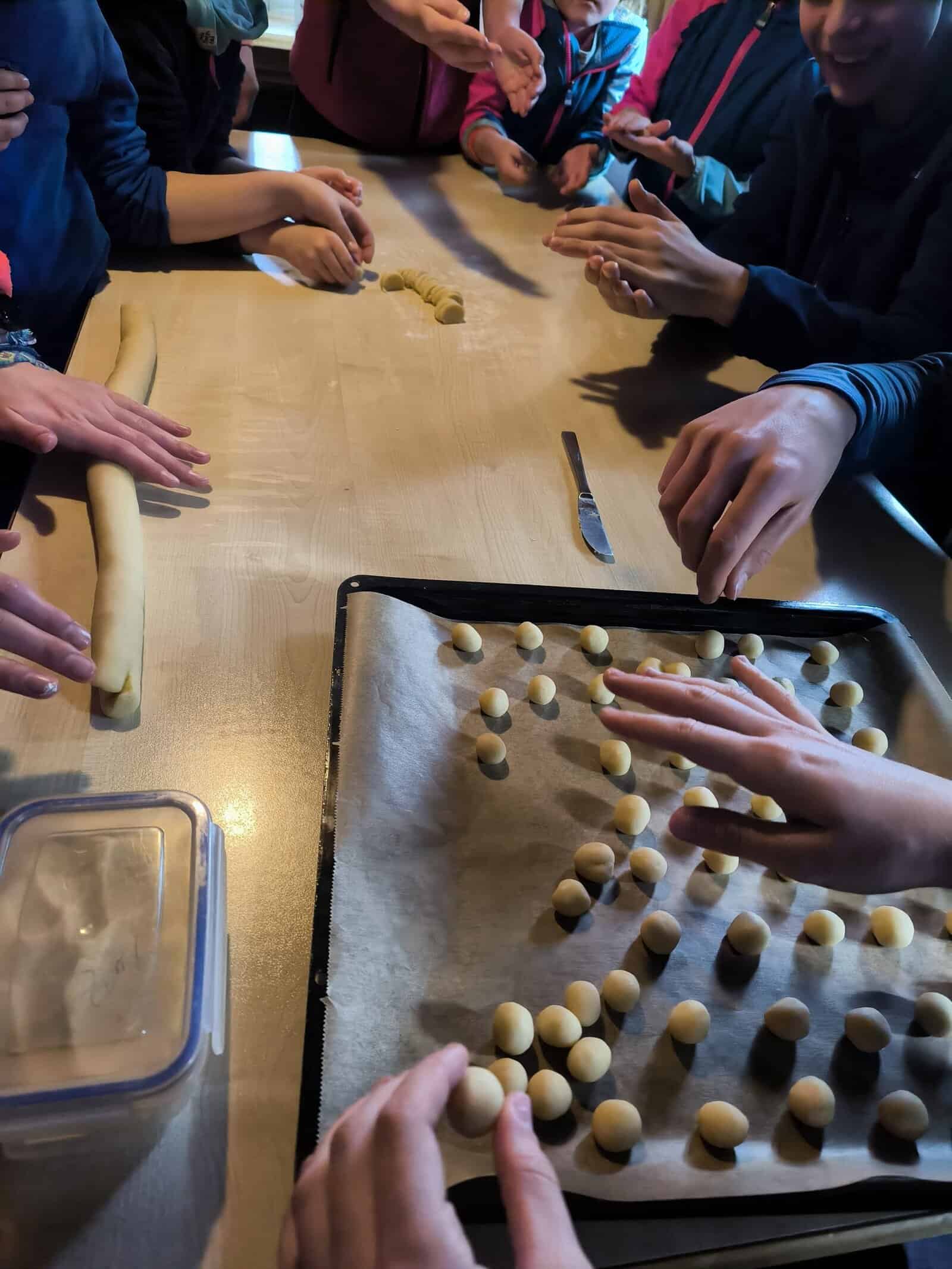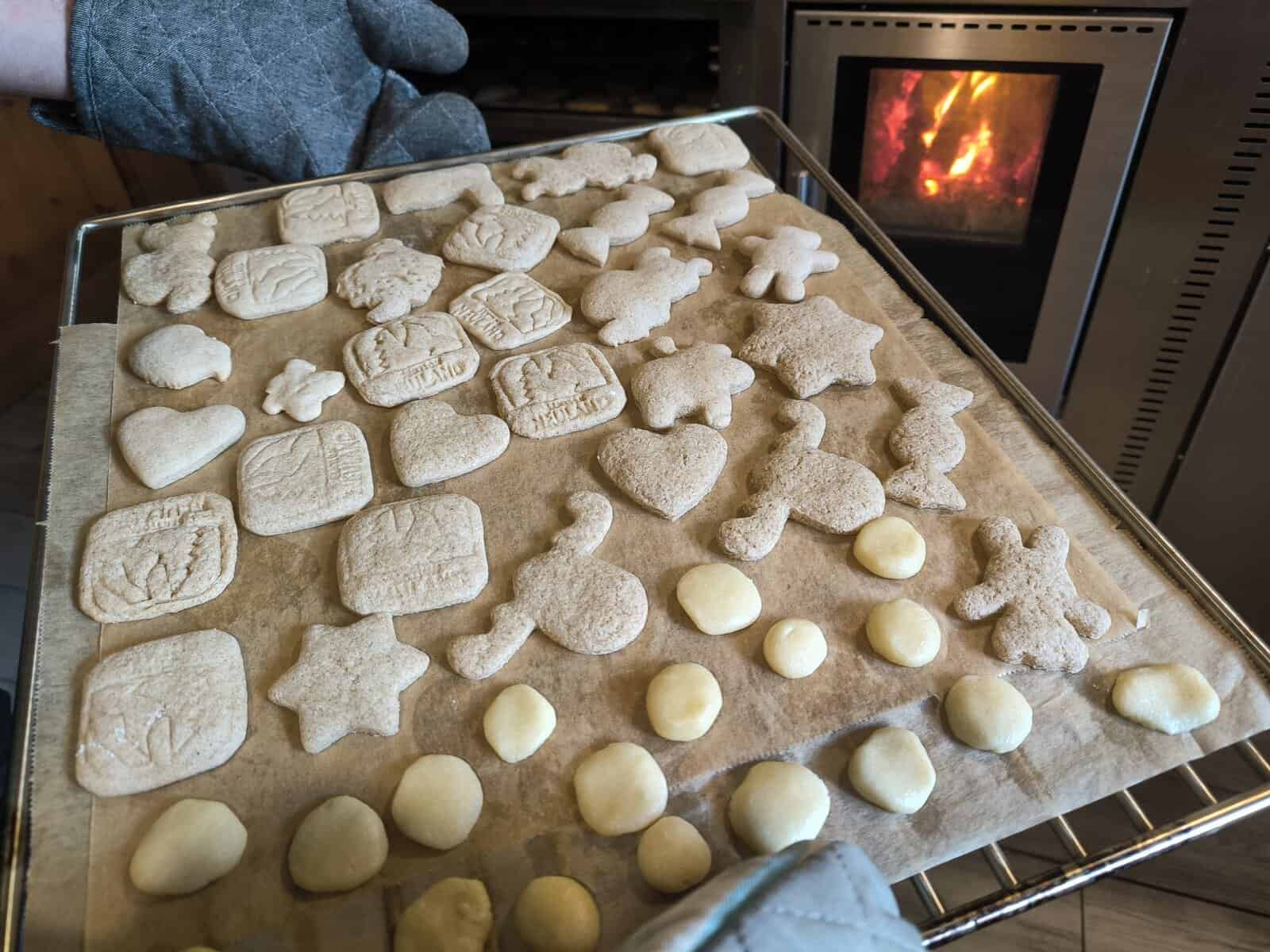 Alle anderen kümmerten sich in der Zeit um das Plätzchenausstechen, -rollen und -formen. Der neue Holzofen war im Dauerbetrieb. Am späten Nachmittag wurden die Plätzchen noch dekoriert, sodass der erste Teil am Samstagabend verzehrt werden konnte. Es wurden ausgiebig Spiele (u.a. Kuhhandel) gespielt, bevor alle müde ins Matratzenlager schlichen. Sonntag früh gratulierten wir erst mal unserem Geburtstagskind in der Runde, warteten geduldig auf die selbstgebackenen Brötchen und spielten, dank des „schönen“ Regens draußen wieder Spiele.