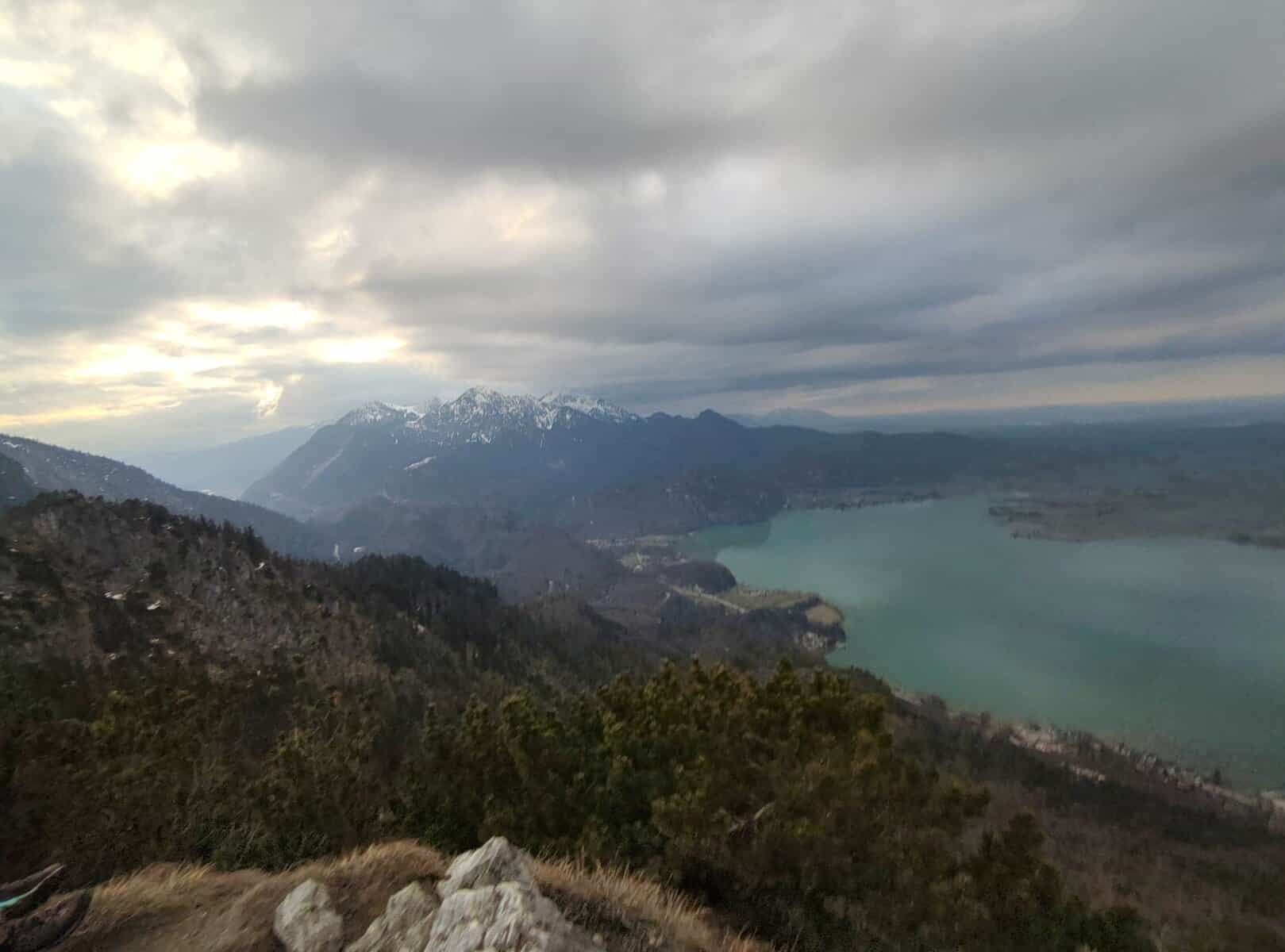 Zunächst nutzten wir den Zug, um nach Kochel zu gelangen, wo eine weitere Teilnehmerin zu uns stieß. Von dort aus waren wir zu Fuß unterwegs und machten uns auf den Weg zum Wanderparkplatz Wasserfall. Dort angekommen, begann der kurze, aber umso steilere Anstieg zur Sonnenspitze. Oben angekommen mussten wir leider feststellen, dass uns das Wetter einen Strich durch die Rechnung gemacht hatte: Der Sonnenuntergang war nicht zu sehen. Die geplante Brotzeitpause machten wir trotzdem, bevor es über das Graseck wieder zurück ins Tal ging.